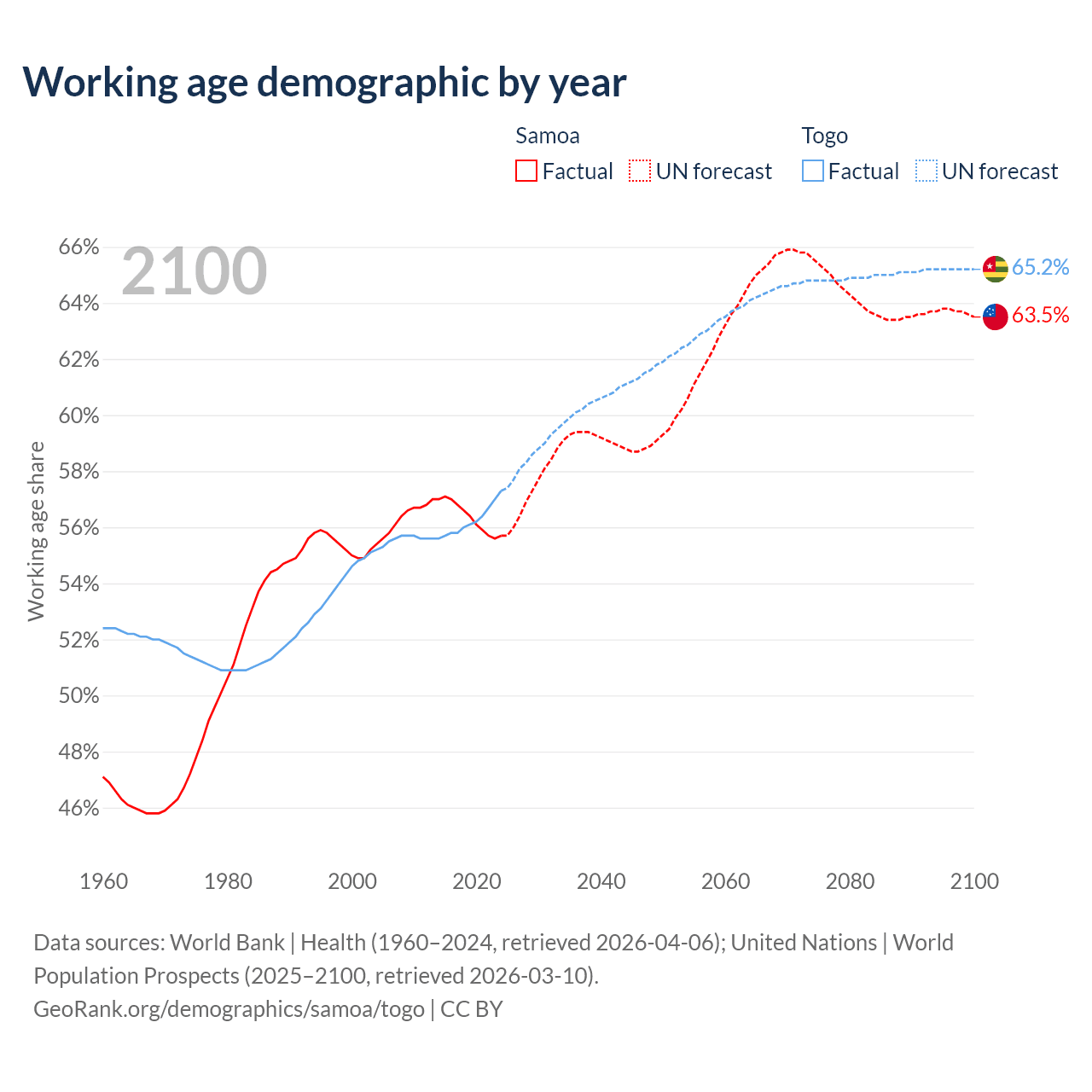 - Samoa has 123K working age adults (aged 15-64) vs 5.72M in Togo.