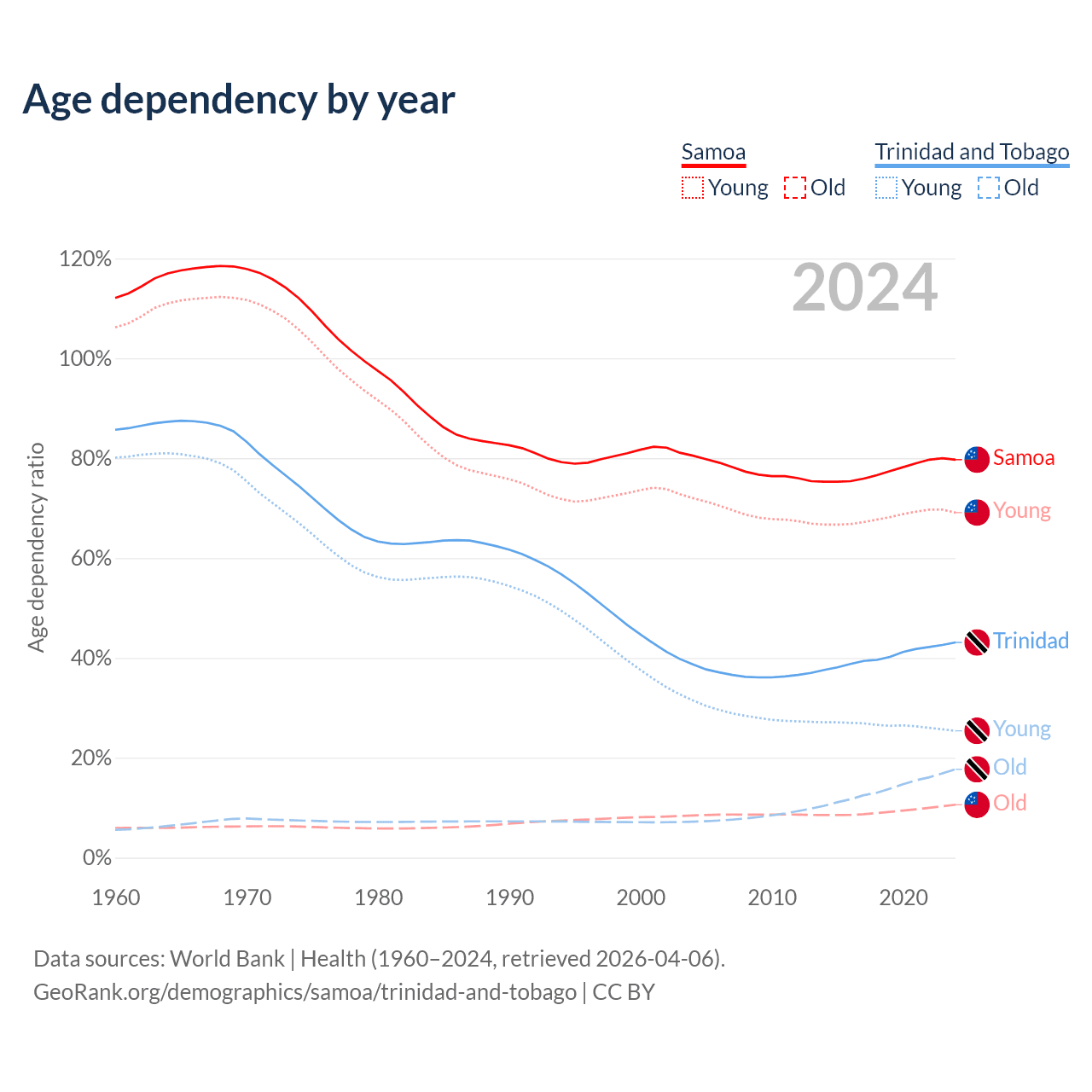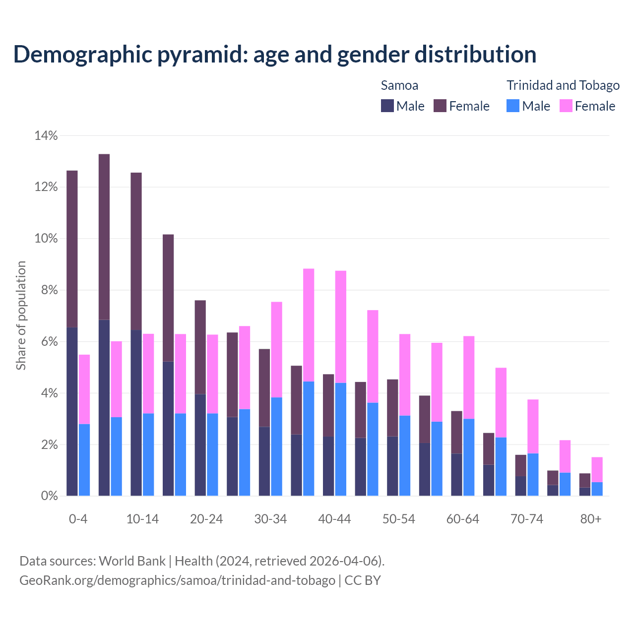 - The share of old-age demographic (65+) in Samoa is 5.88% vs 12.4% in Trinidad and Tobago.