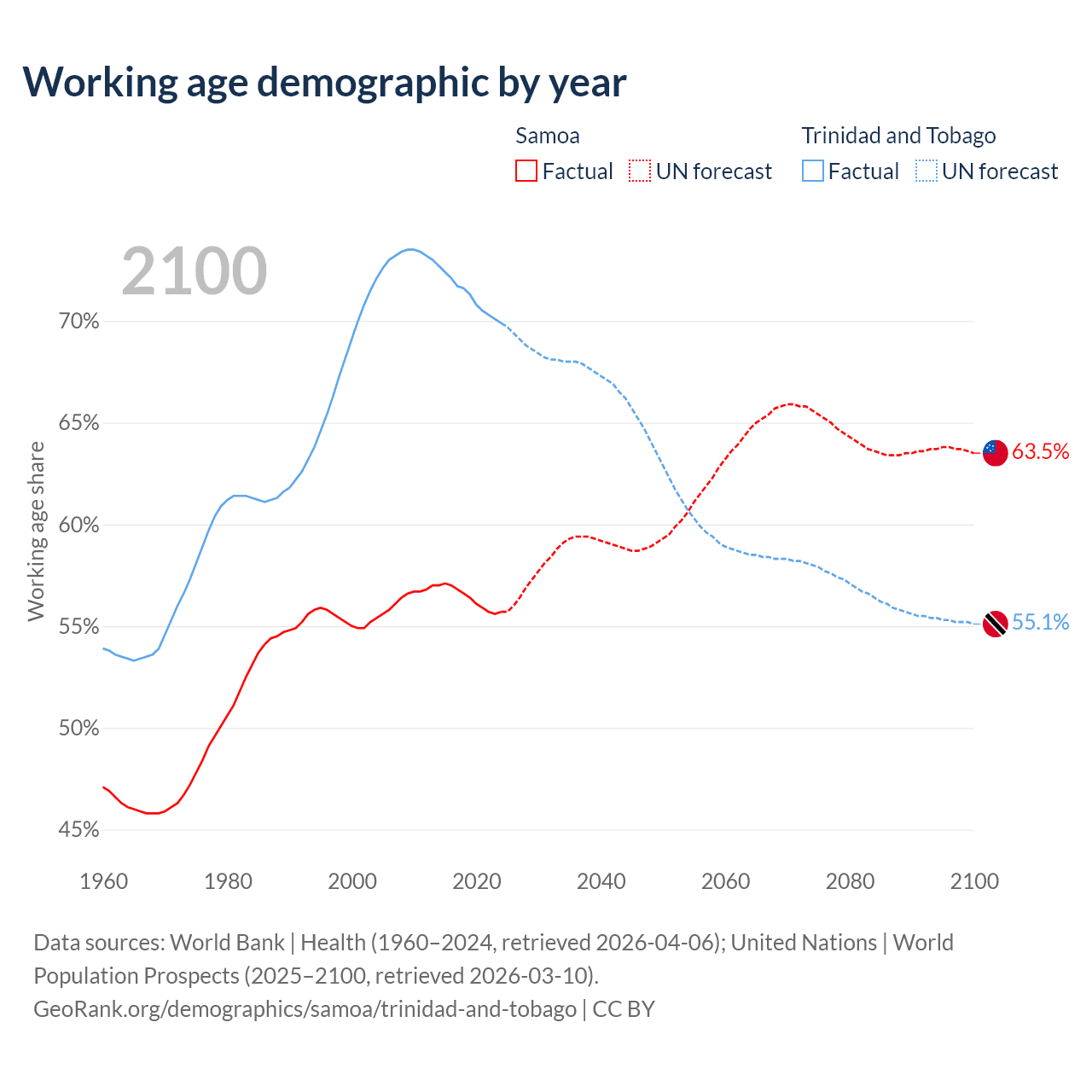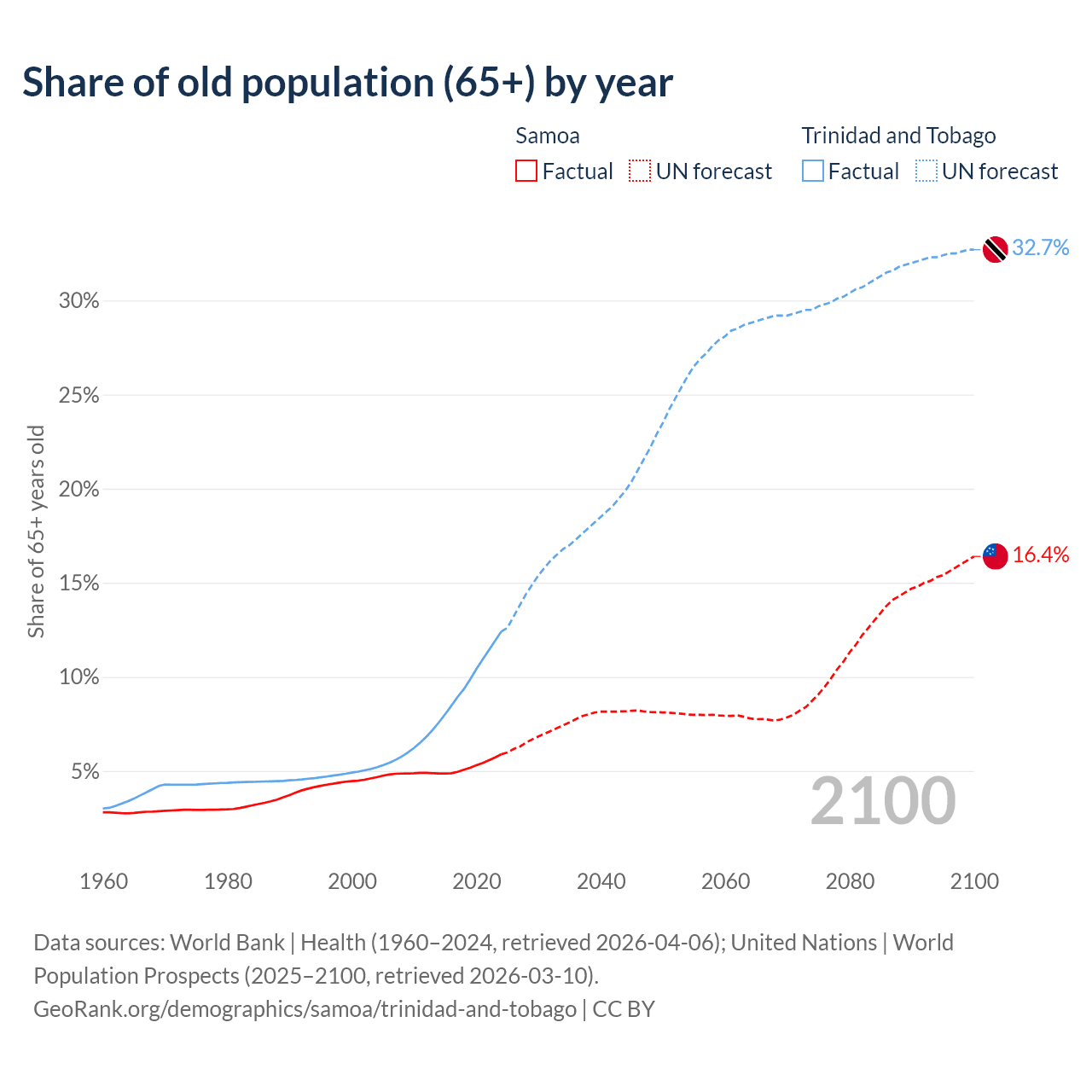 The share of older people aged 65 and over is 5.88% in Samoa and 12.4% in Trinidad and Tobago. Life expectancy in Samoa compared to Trinidad and Tobago .