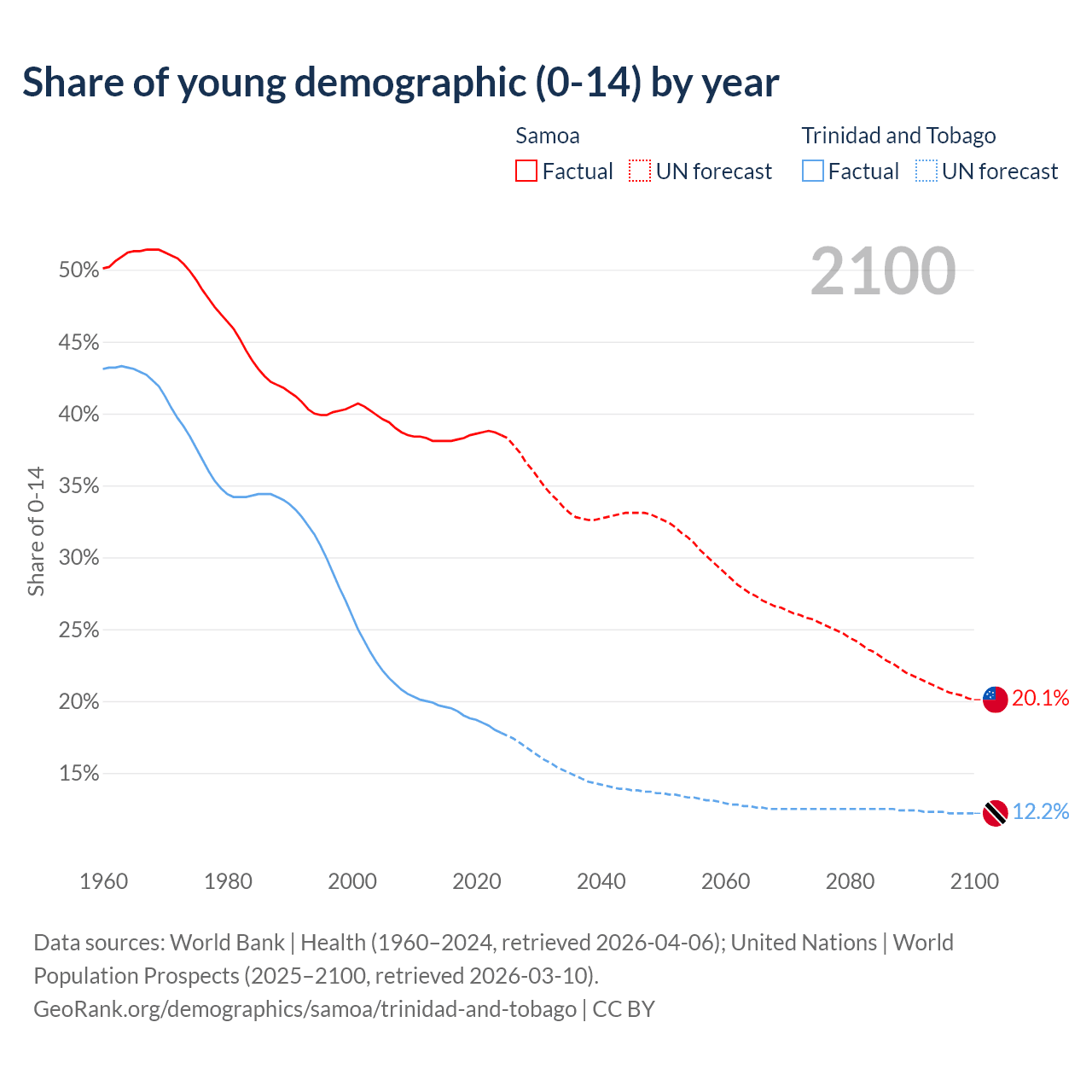 - The share of young demographic (0-15 years old) in Samoa is 38.5% vs 17.8% in Trinidad and Tobago.