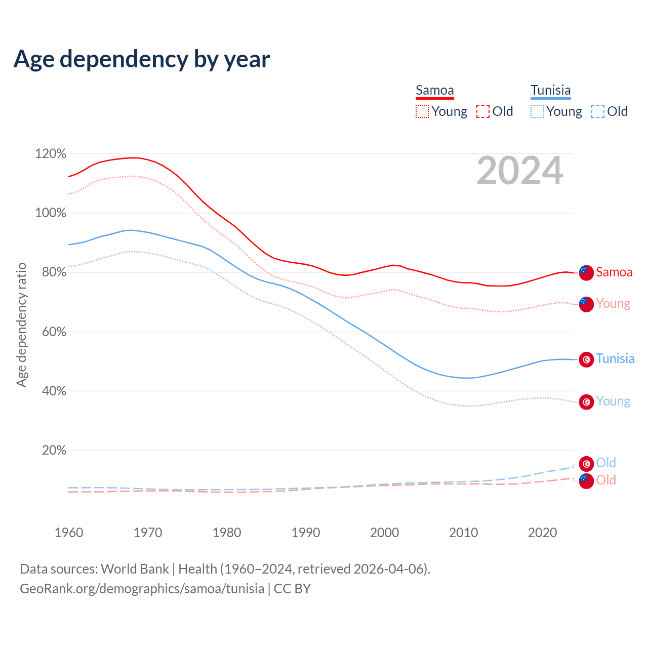 - The share of old-age demographic (65+) in Samoa is 5.88% vs 9.53% in Tunisia.