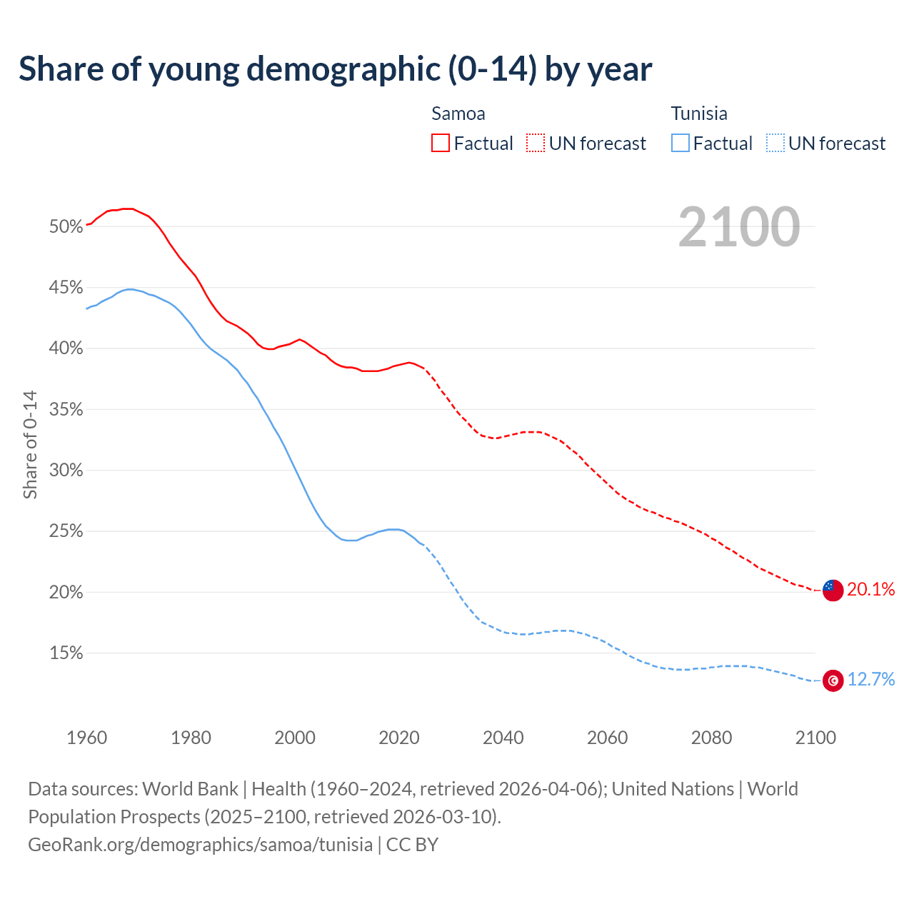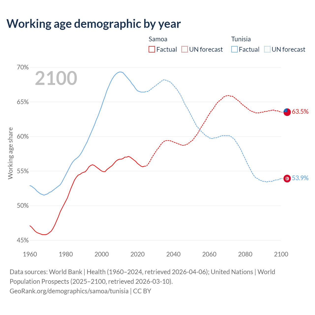 Median age Samoa vs Tunisia, 1960-2100
