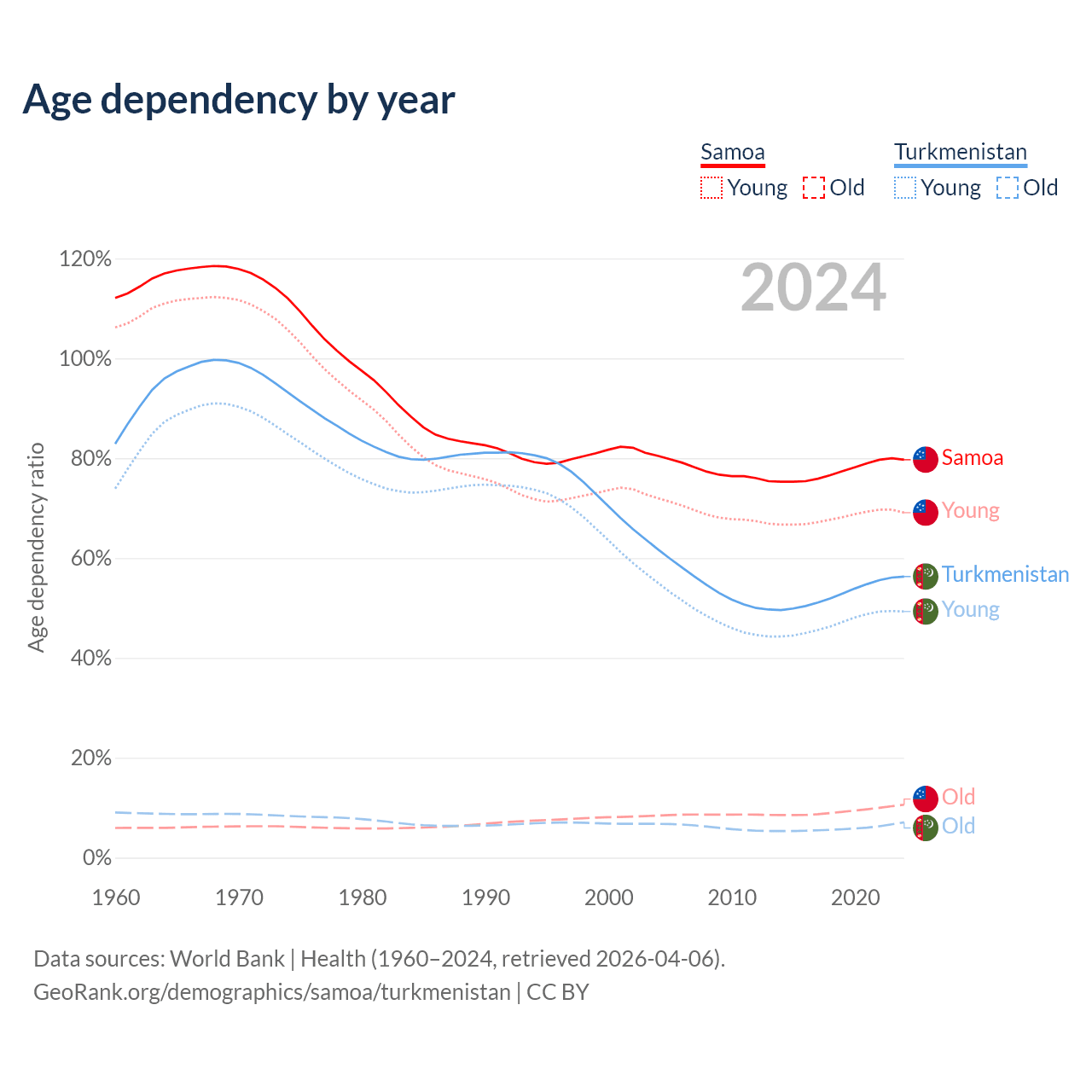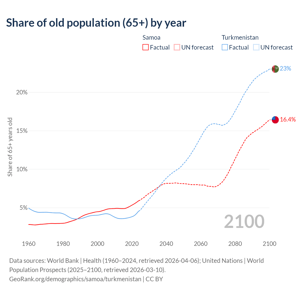 - The share of old-age demographic (65+) in Samoa is 5.88% vs 4.53% in Turkmenistan.