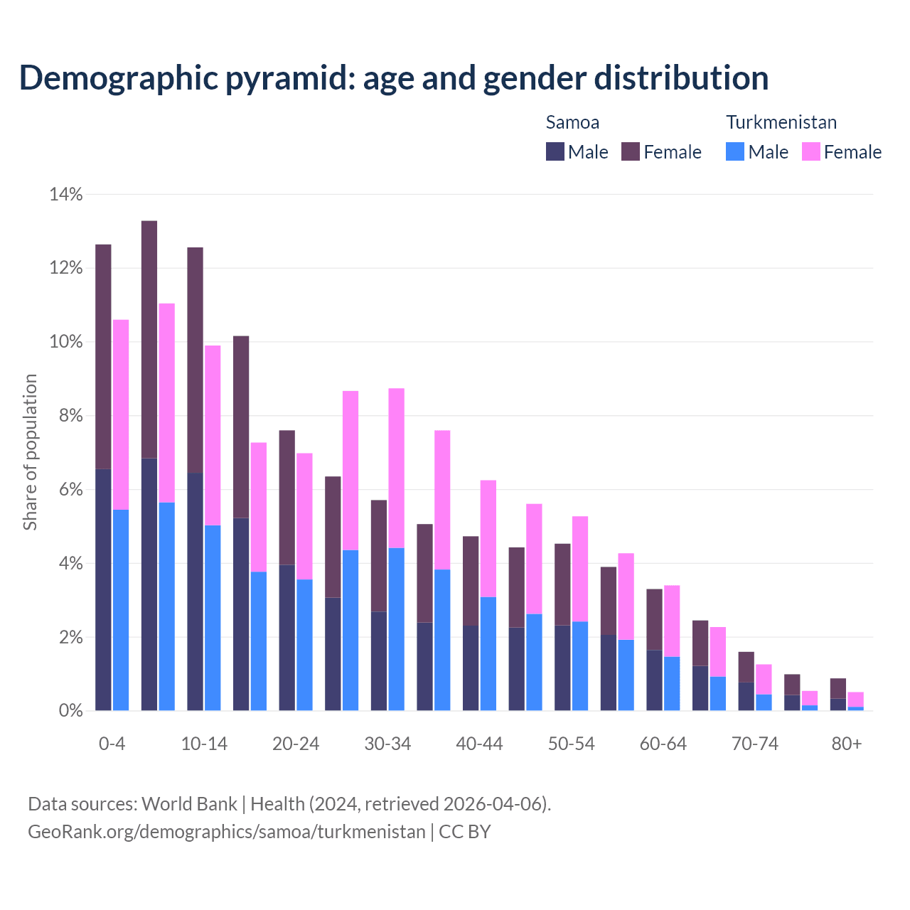 - Samoa is ranked 158/196 by median age (oldest to youngest) vs 119/196 for Turkmenistan.