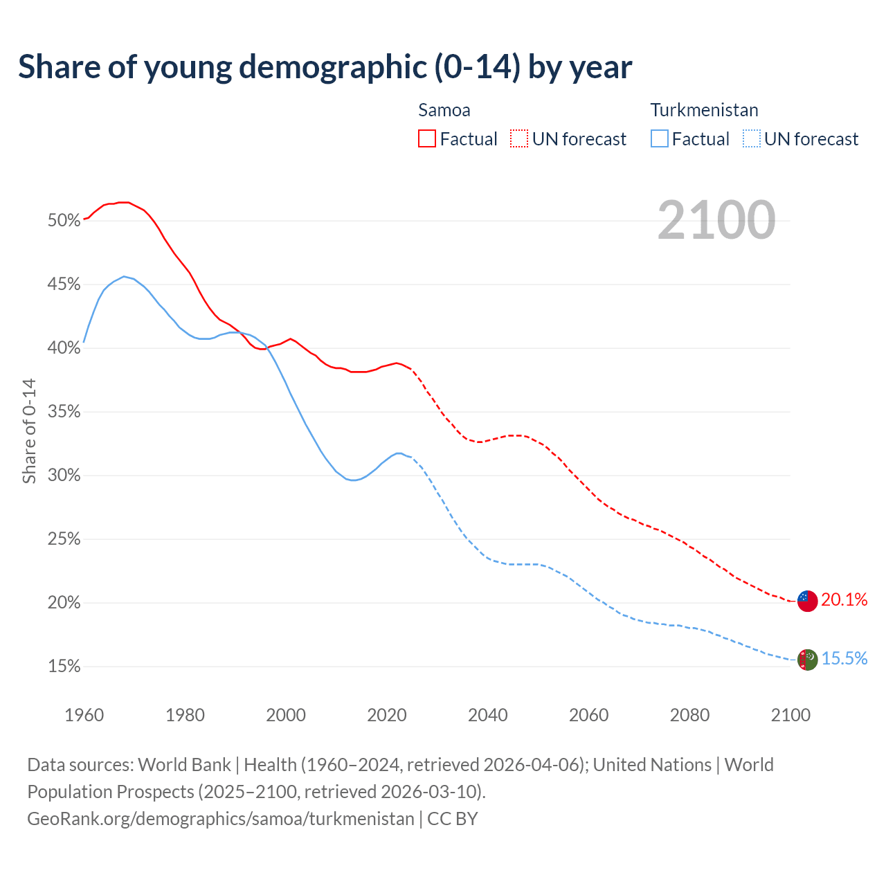 - The share of young demographic (0-15 years old) in Samoa is 38.5% vs 31.5% in Turkmenistan.
