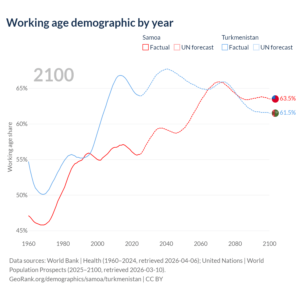 - Samoa has 123K working age adults (aged 15-64) vs 4.97M in Turkmenistan.