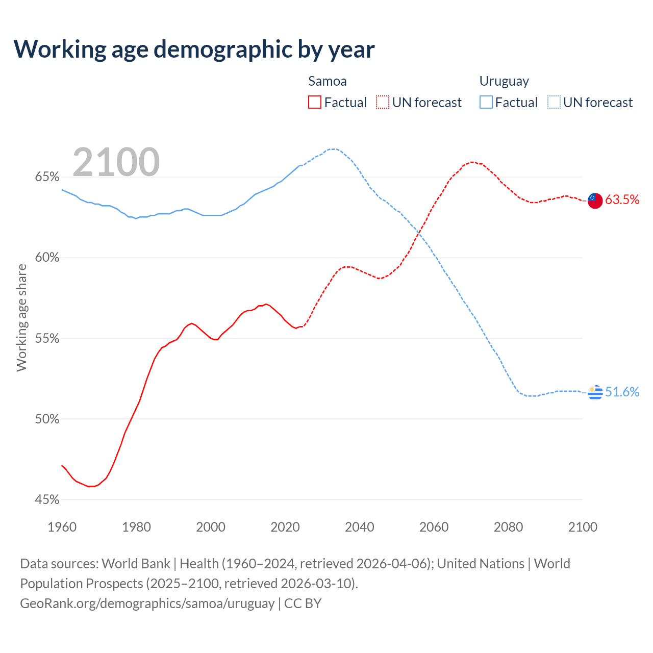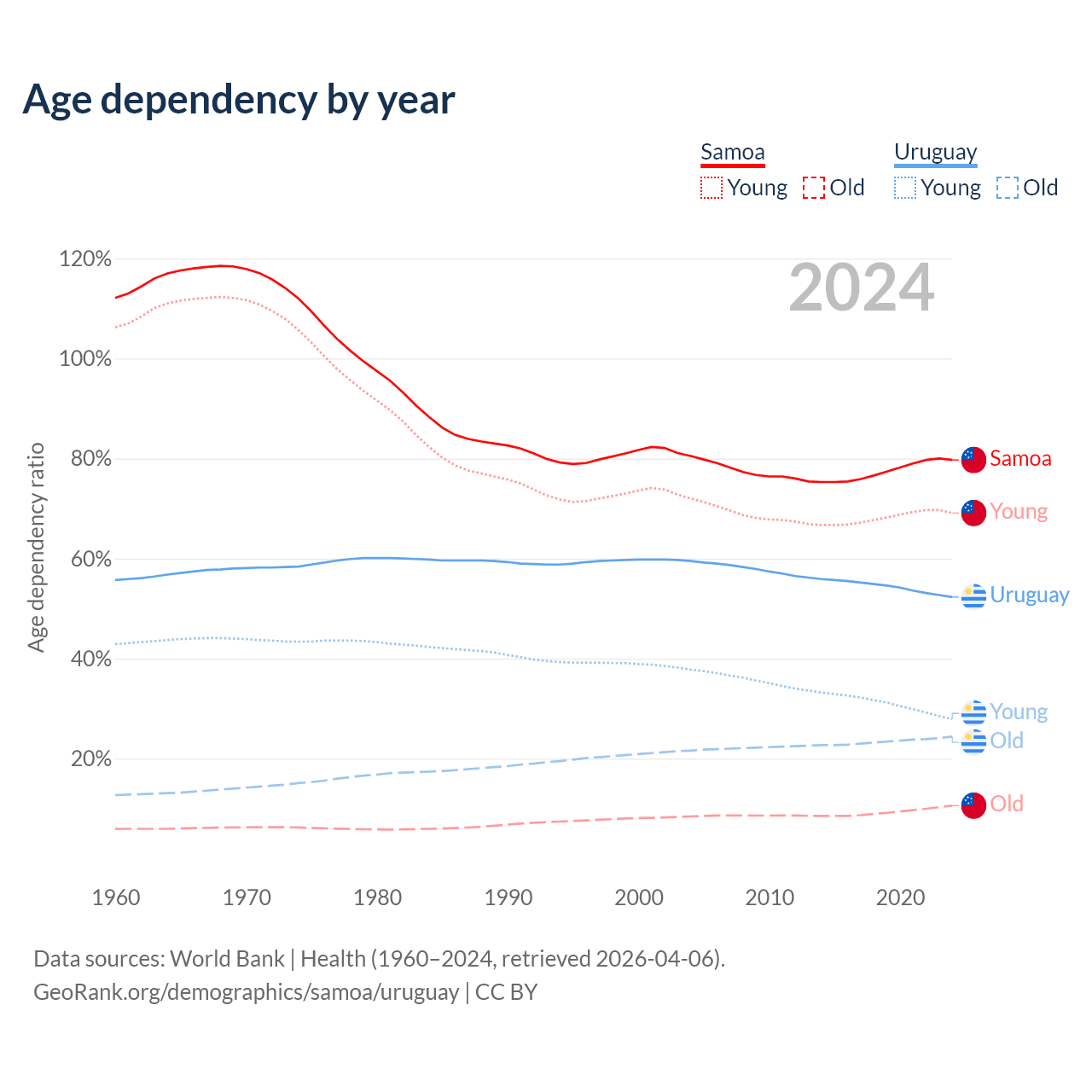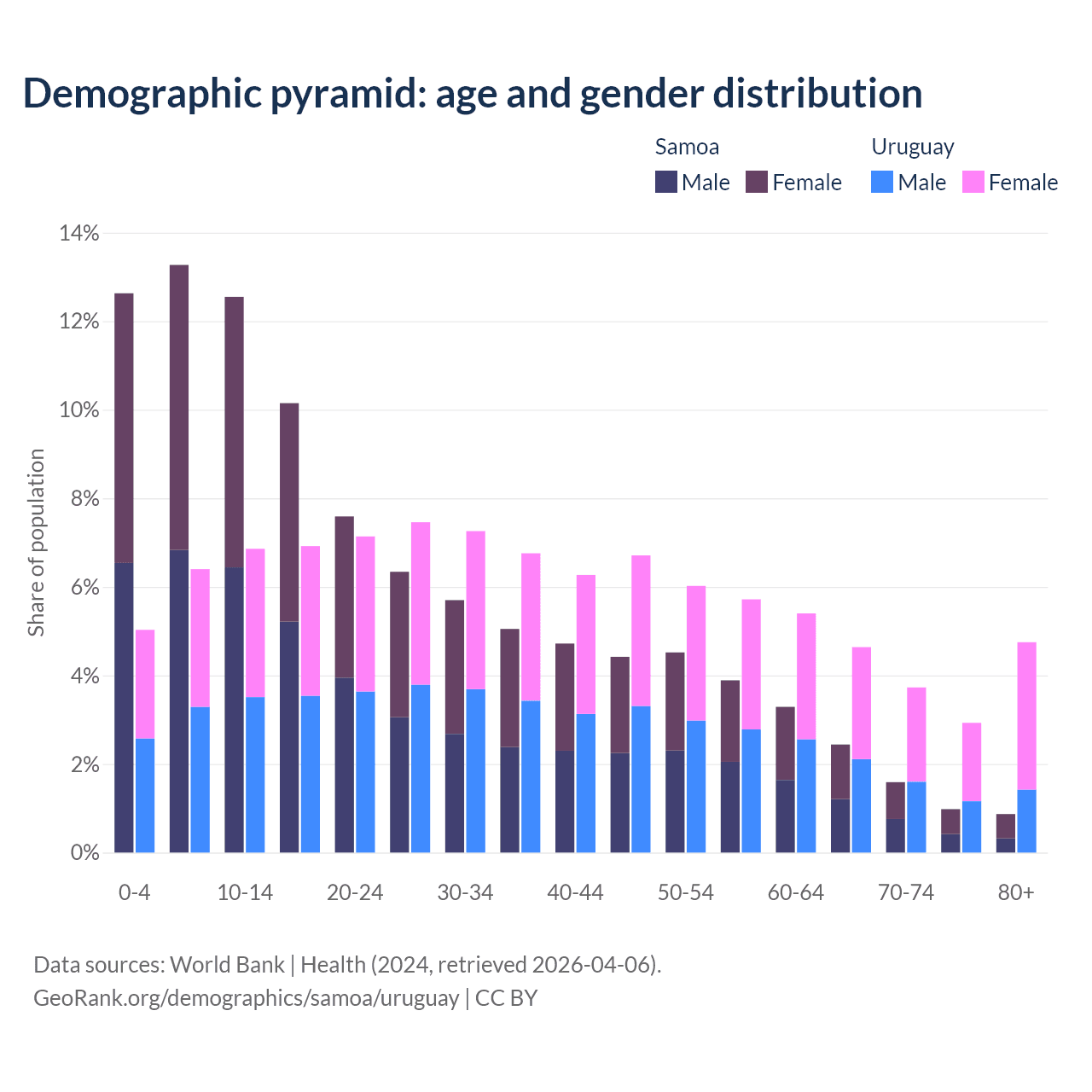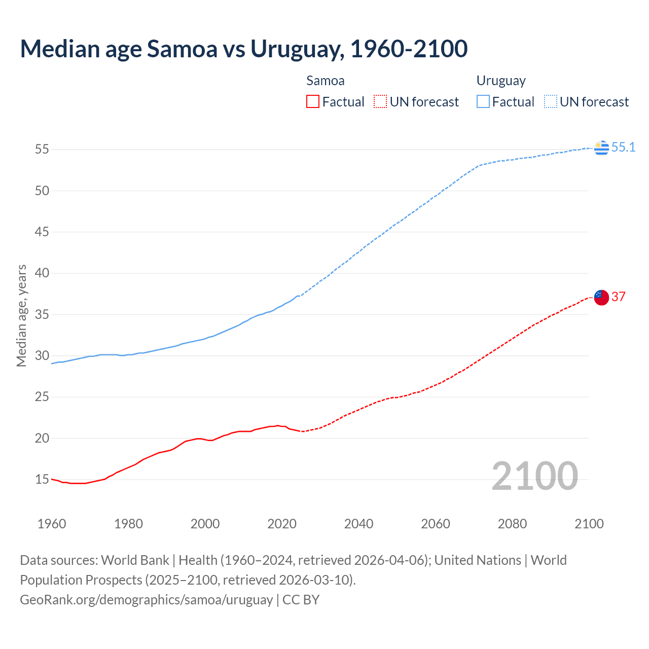 - Samoa is ranked 158/196 by median age (oldest to youngest) vs 63/196 for Uruguay.