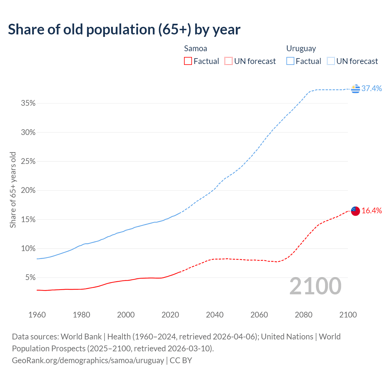 - The share of old-age demographic (65+) in Samoa is 5.88% vs 16% in Uruguay.