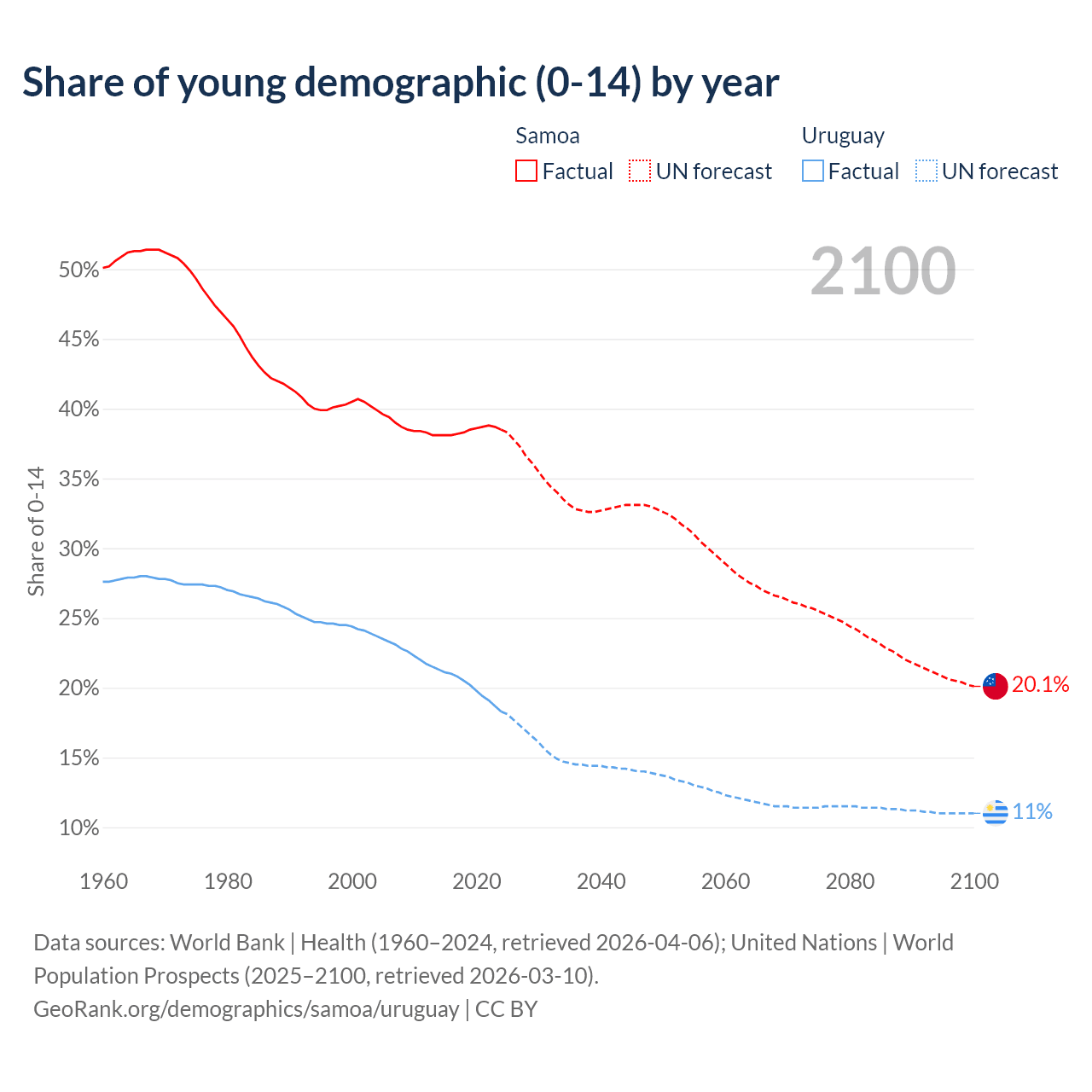 - The share of young demographic (0-15 years old) in Samoa is 38.5% vs 18.3% in Uruguay.