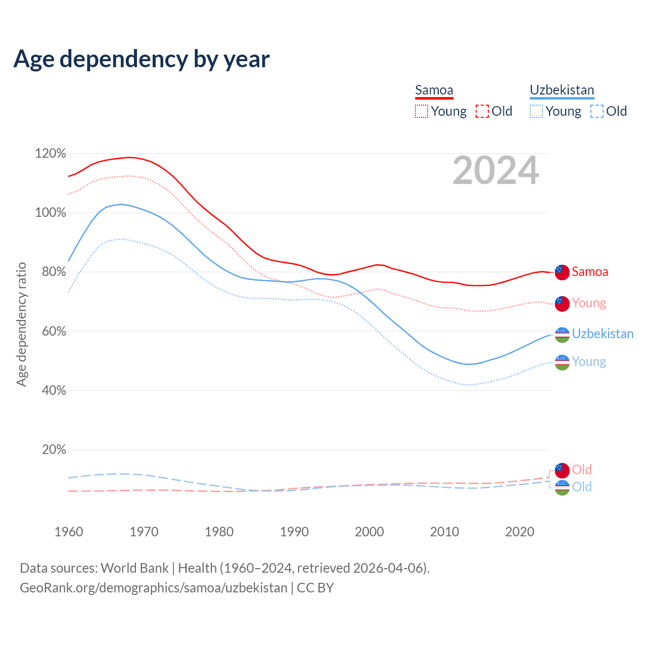 Data sources: World Bank | Health (1960–2024, retrieved 2026-04-06); U.S. Census Bureau (1960–2024, retrieved 2026-02-08).