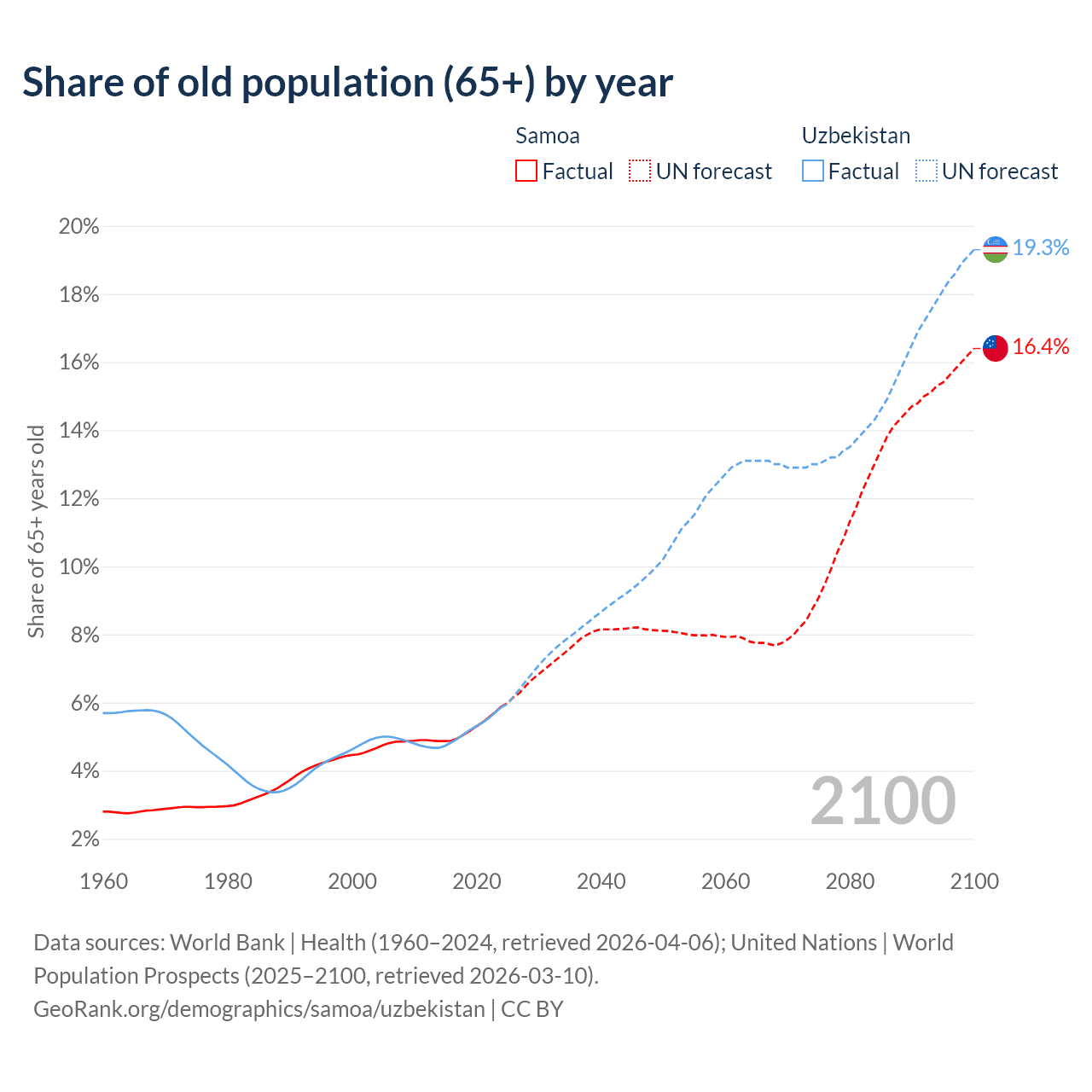 - The share of old-age demographic (65+) in Samoa is 5.88% vs 5.86% in Uzbekistan.