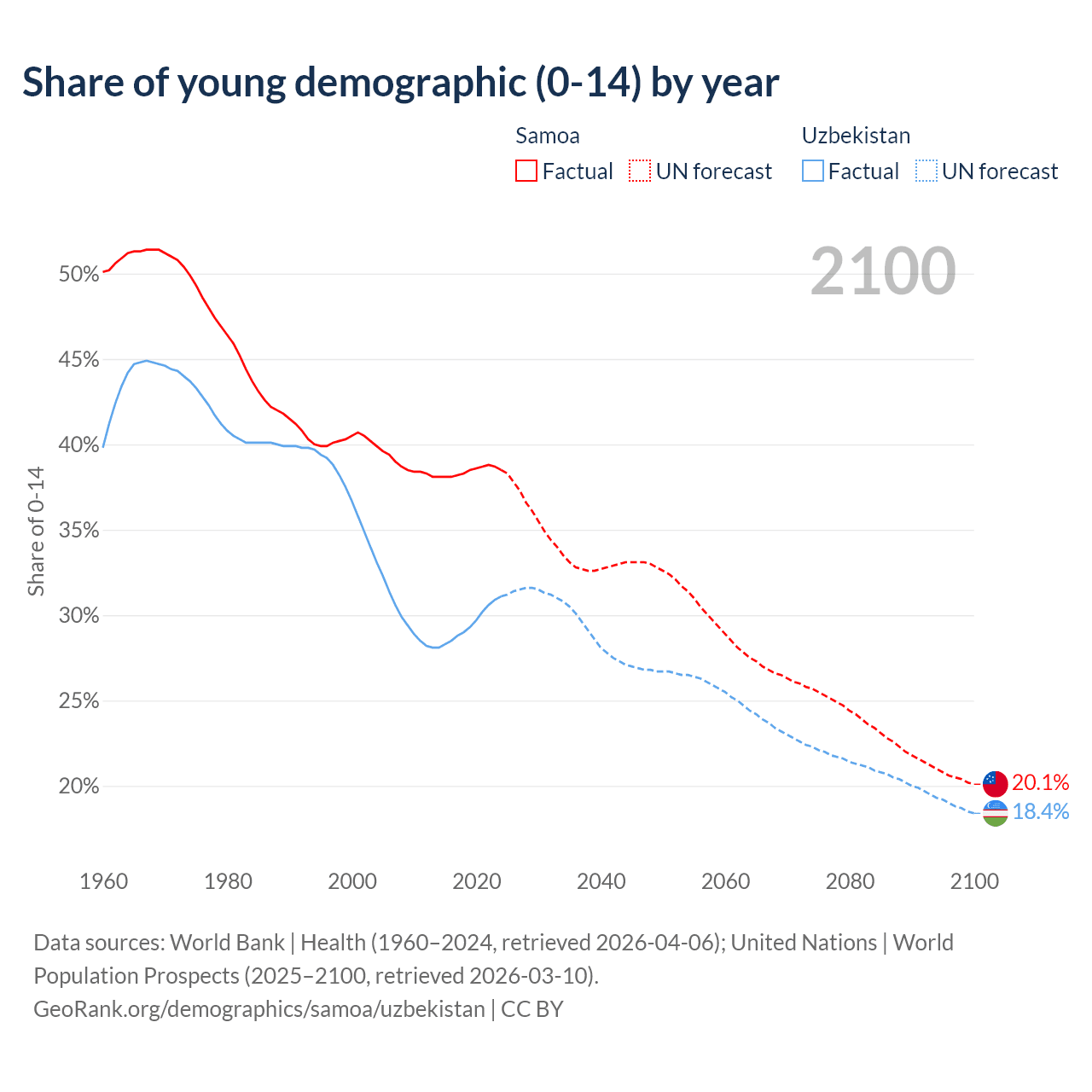 - The share of young demographic (0-15 years old) in Samoa is 38.5% vs 31.1% in Uzbekistan.