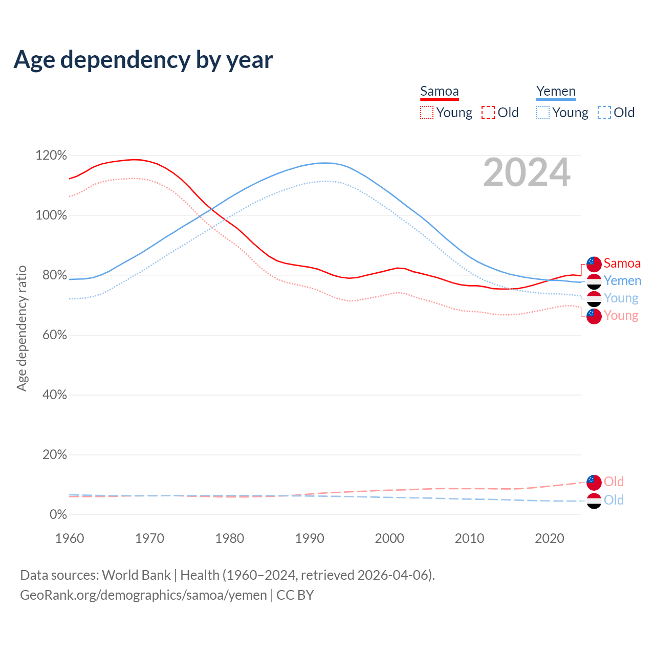 - The share of old-age demographic (65+) in Samoa is 5.88% vs 2.52% in Yemen.