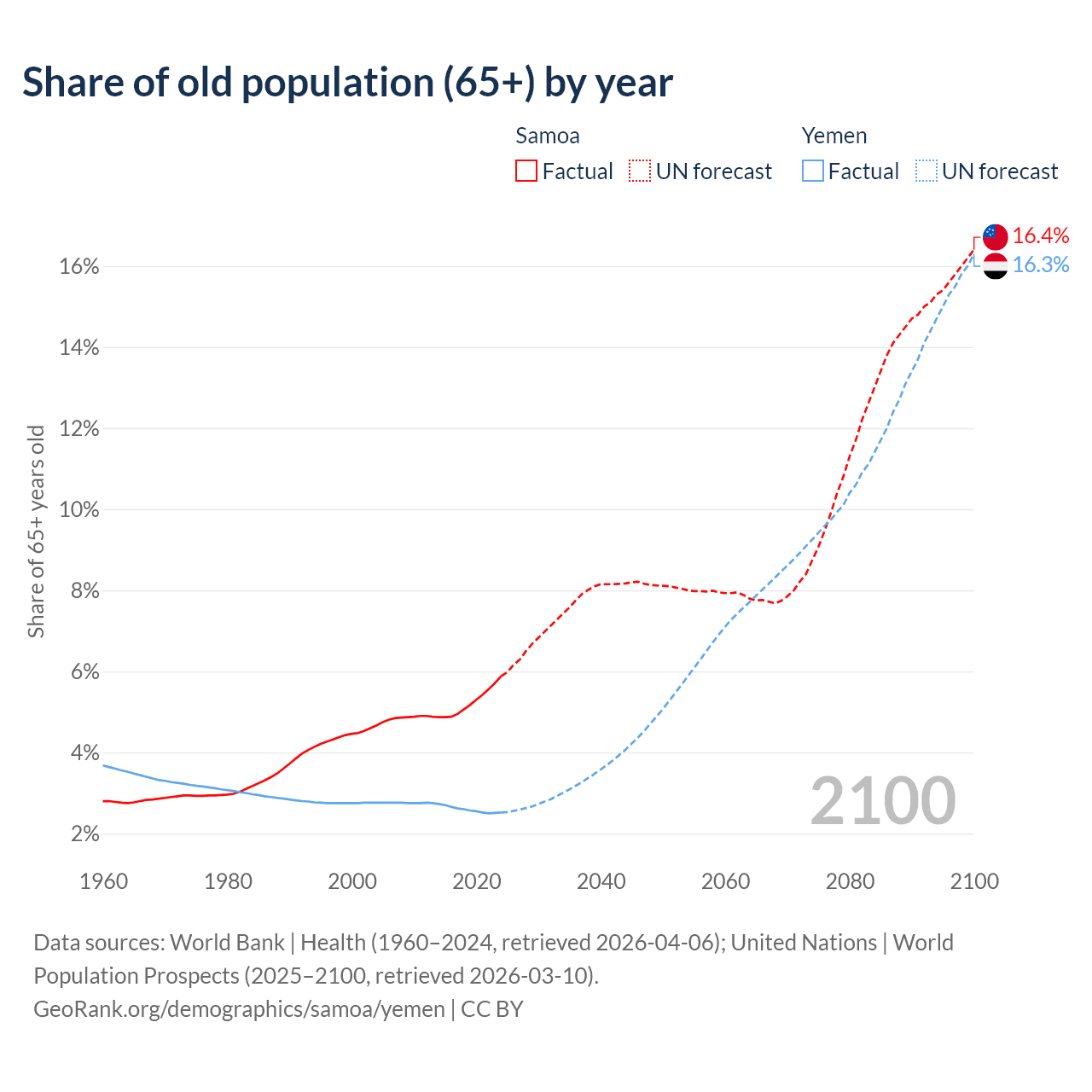 The share of older people aged 65 and over is 5.88% in Samoa and 2.52% in Yemen. Life expectancy in Samoa compared to Yemen .