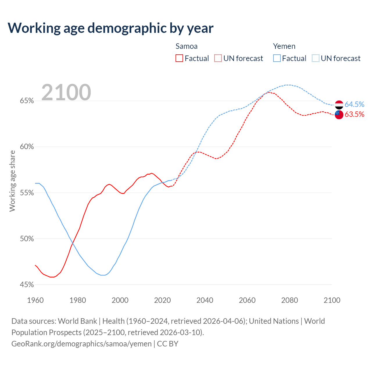 - The share of young demographic (0-15 years old) in Samoa is 38.5% vs 41.1% in Yemen.
