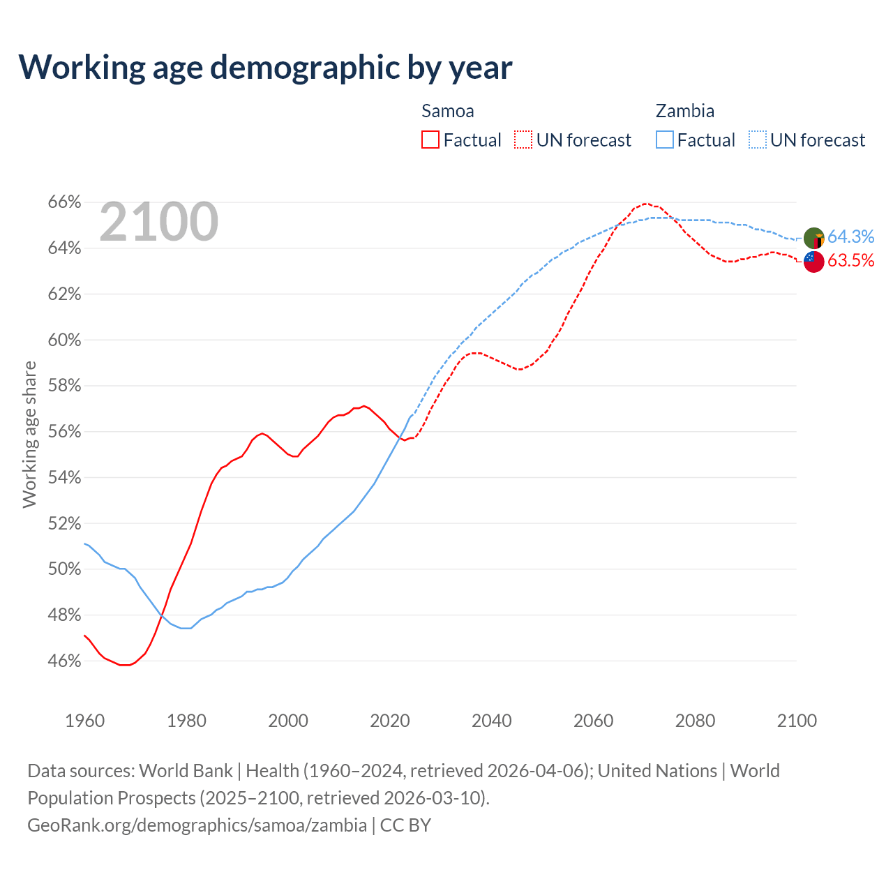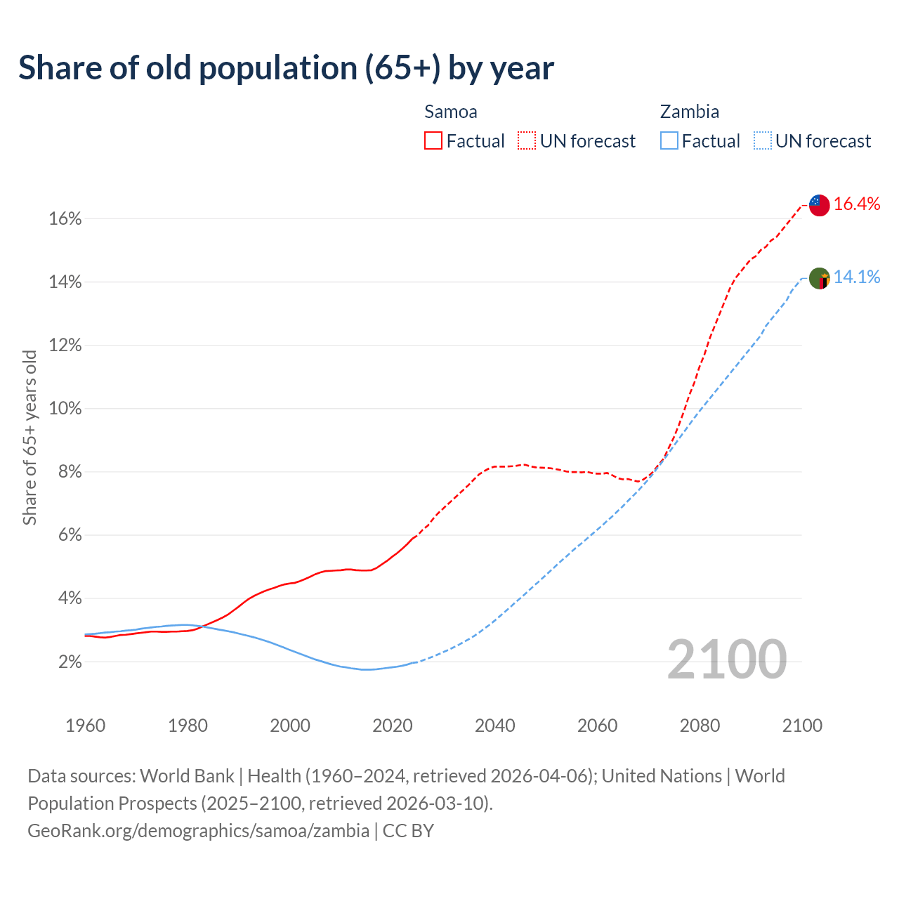 The share of older people aged 65 and over is 5.88% in Samoa and 1.95% in Zambia. Life expectancy in Samoa compared to Zambia .