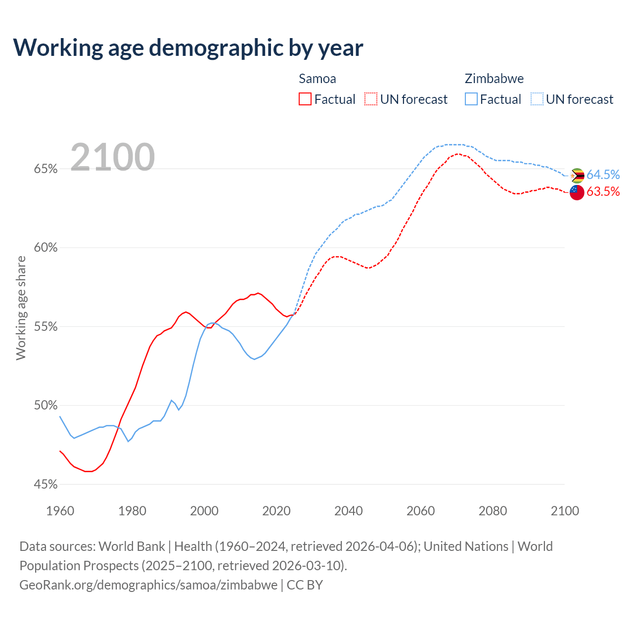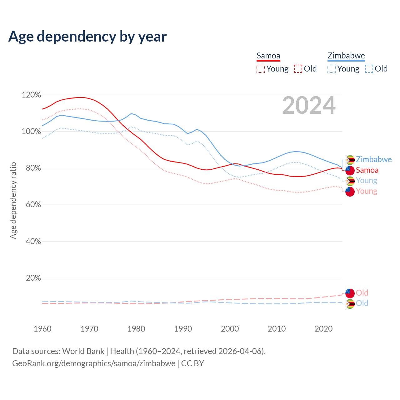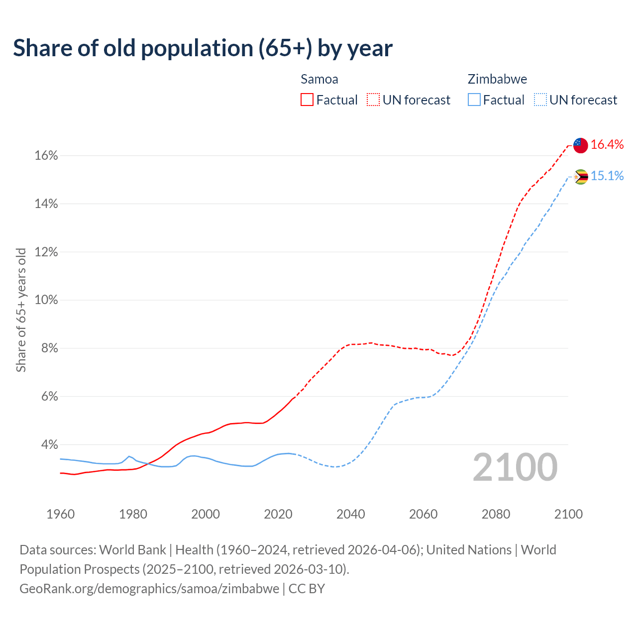- The share of old-age demographic (65+) in Samoa is 5.88% vs 3.6% in Zimbabwe.