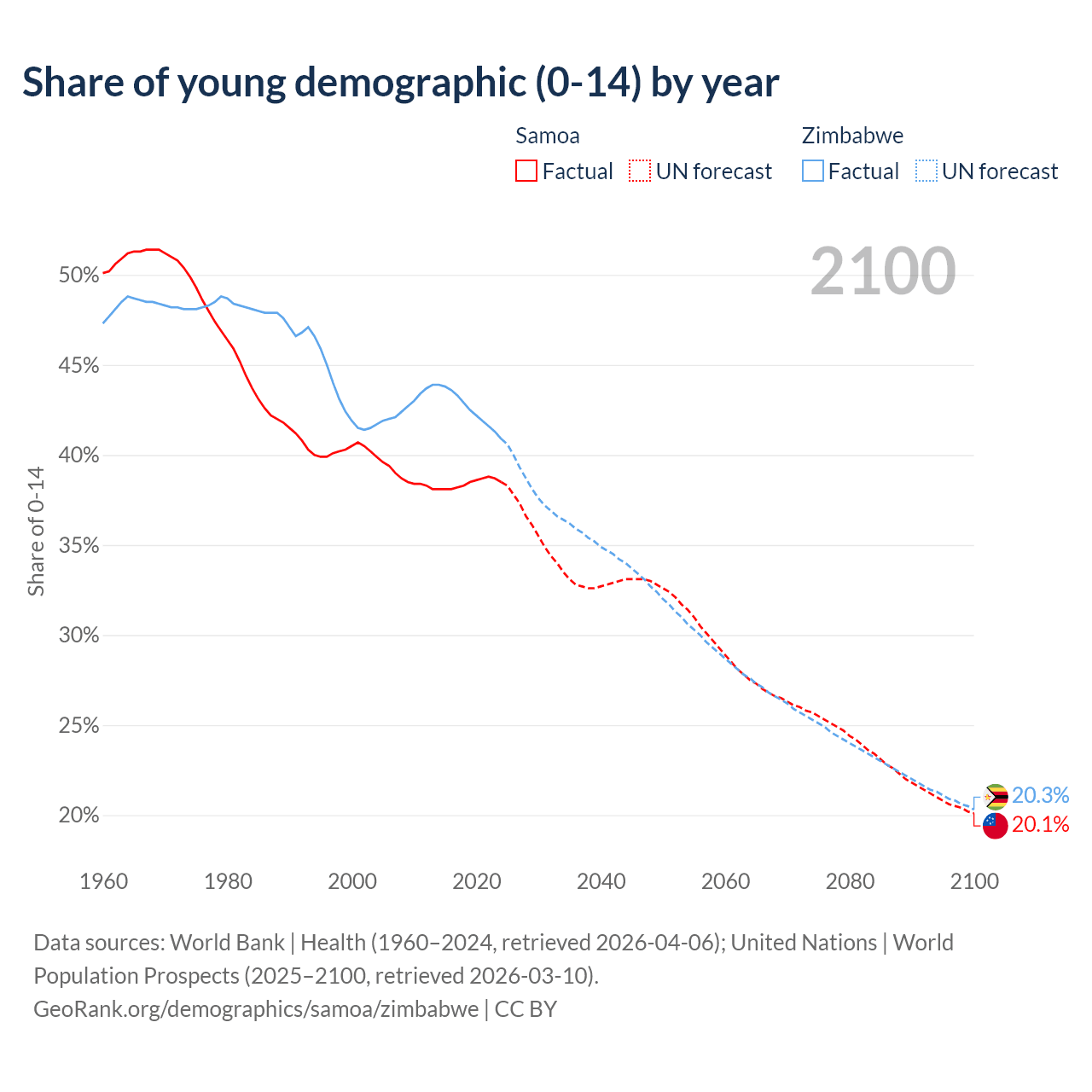 - The share of young demographic (0-15 years old) in Samoa is 38.5% vs 40.9% in Zimbabwe.