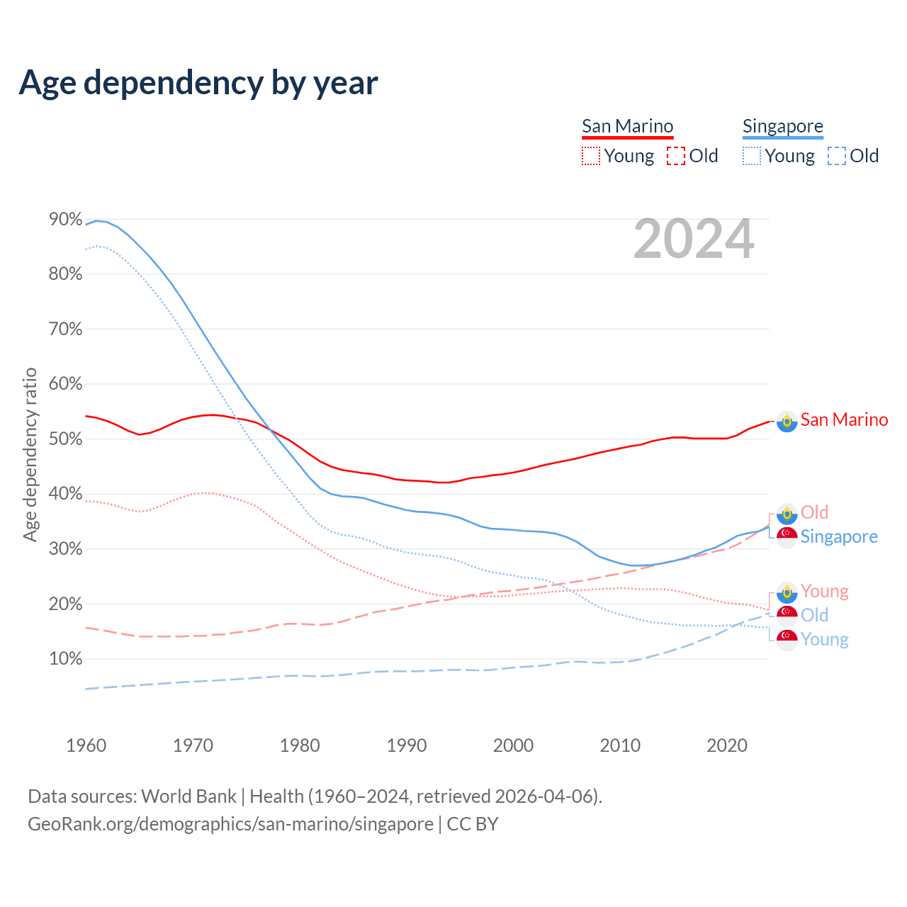- San Marino is ranked 3/196 by median age (oldest to youngest) vs 68/196 for Singapore.