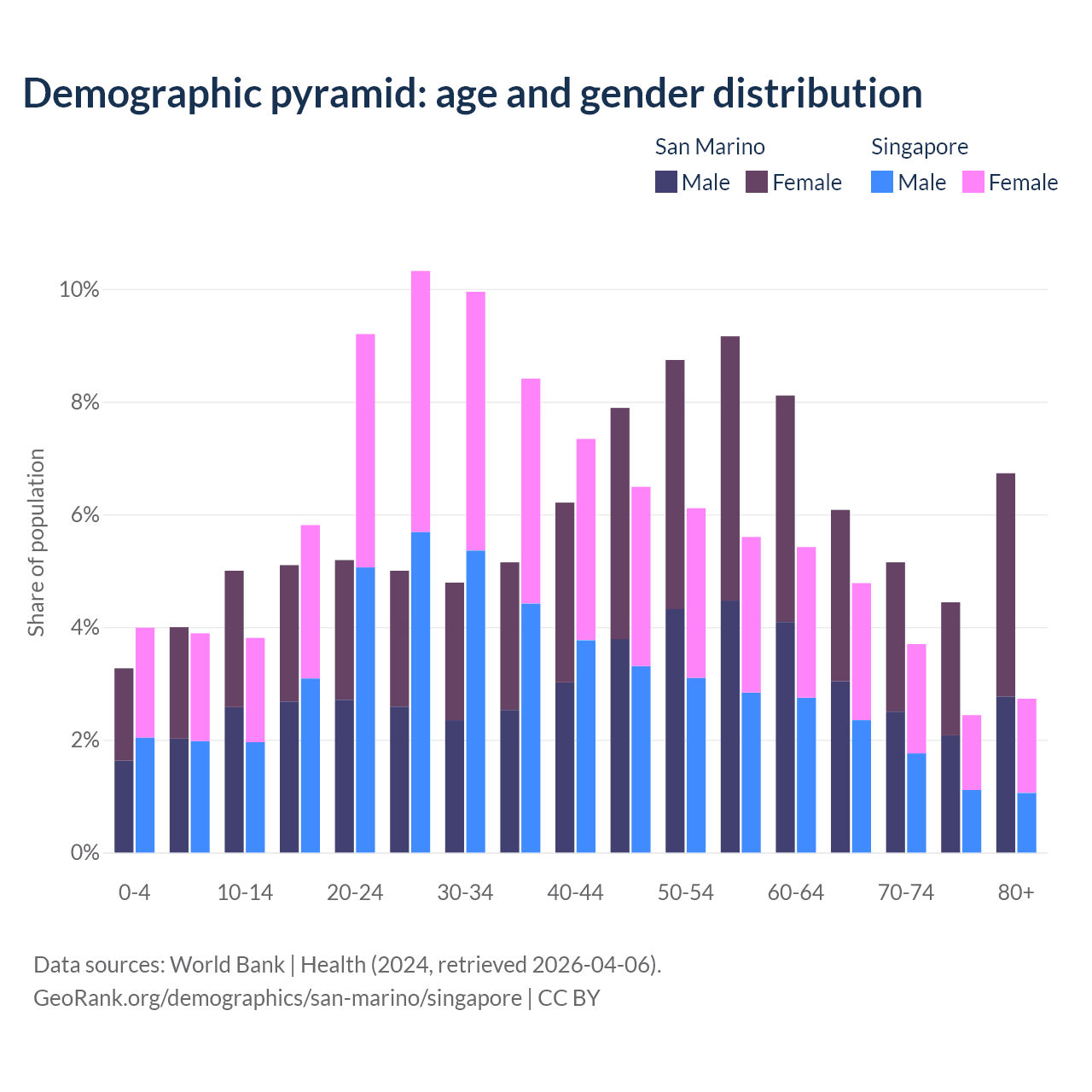 The share of older people aged 65 and over is 22.4% in San Marino and 13.7% in Singapore. Life expectancy in San Marino compared to Singapore .