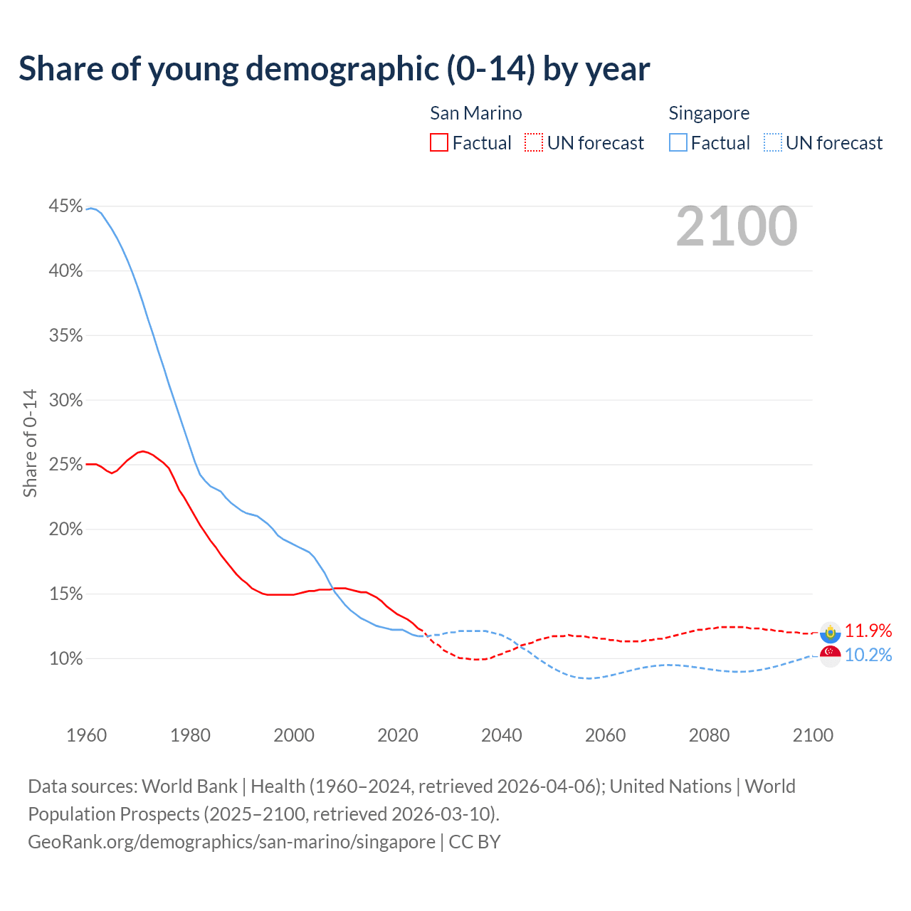 - The share of young demographic (0-15 years old) in San Marino is 12.3% vs 11.7% in Singapore.