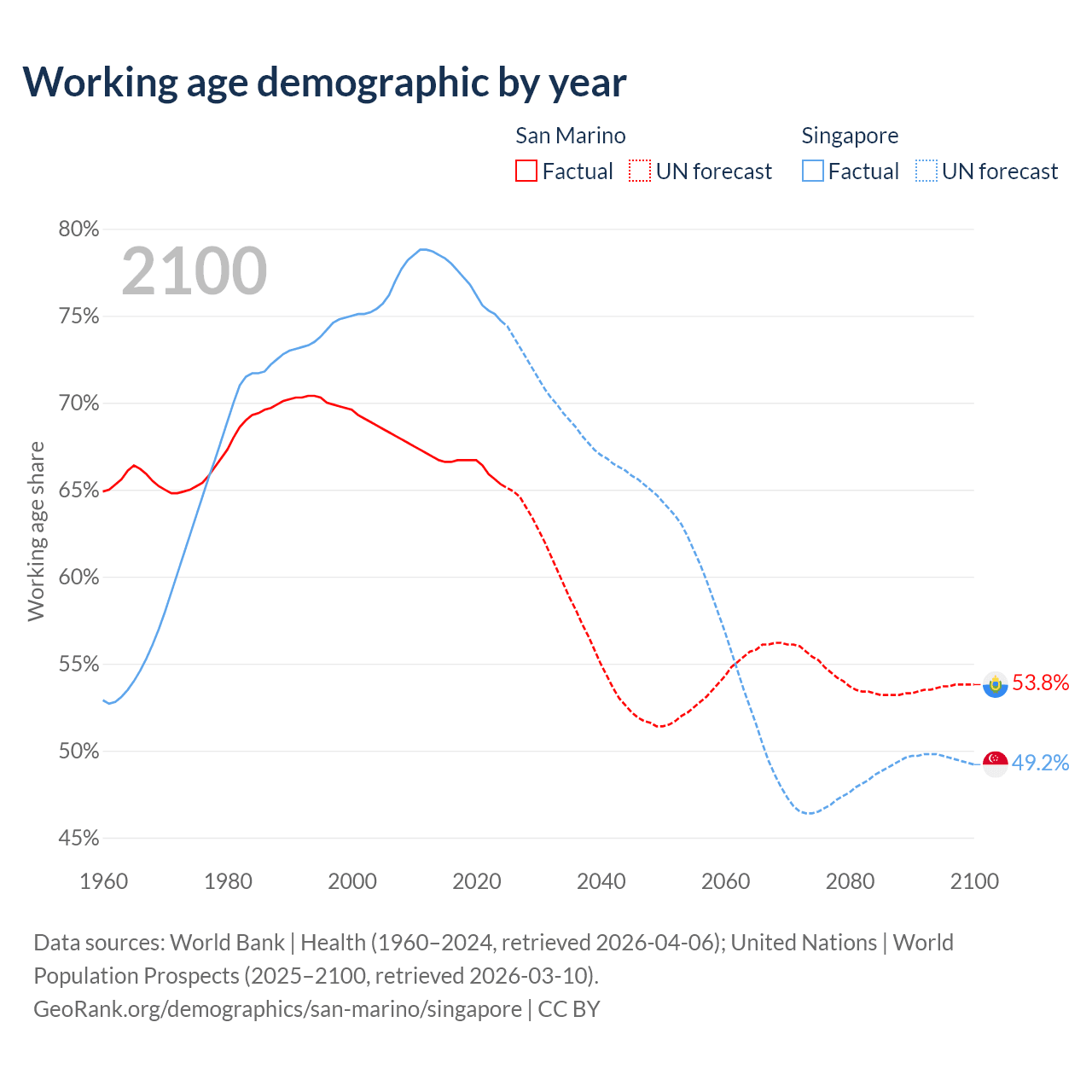 - San Marino has 22.2K working age adults (aged 15-64) vs 4.57M in Singapore.