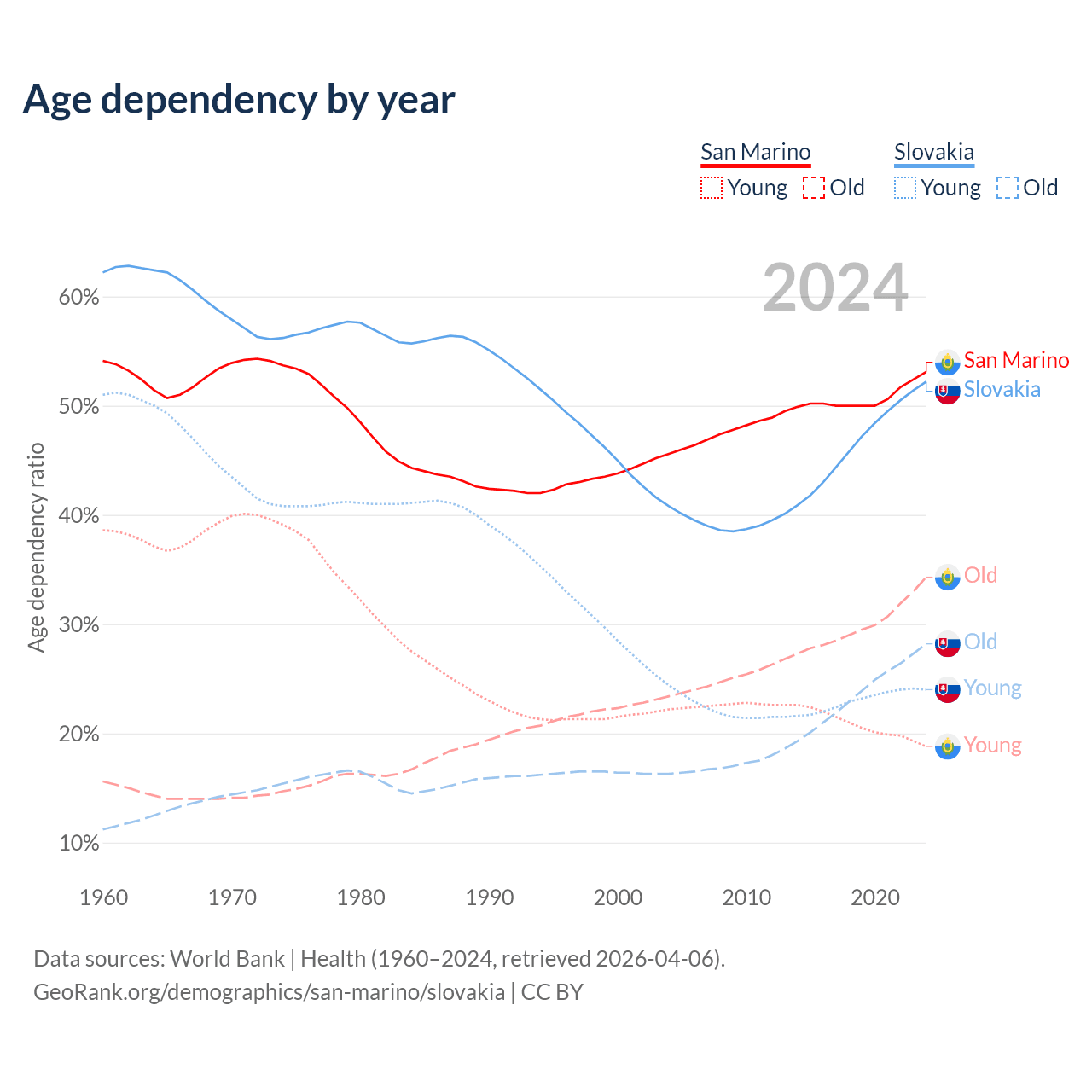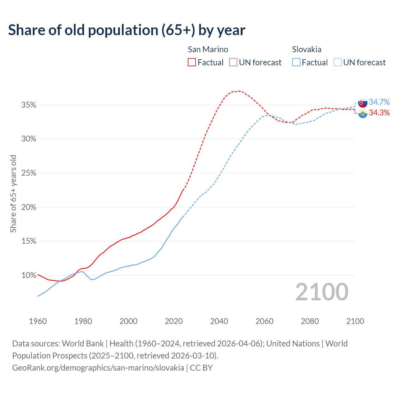 - The share of old-age demographic (65+) in San Marino is 22.4% vs 18.5% in Slovakia.