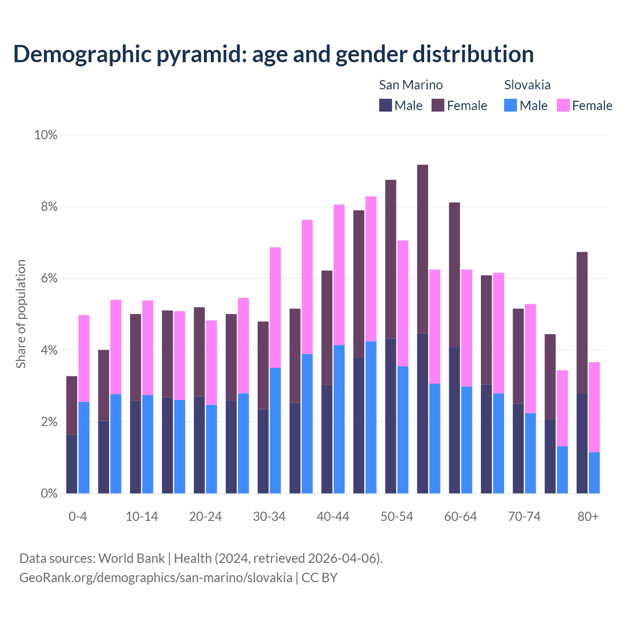 - San Marino is ranked 3/196 by median age (oldest to youngest) vs 31/196 for Slovakia.