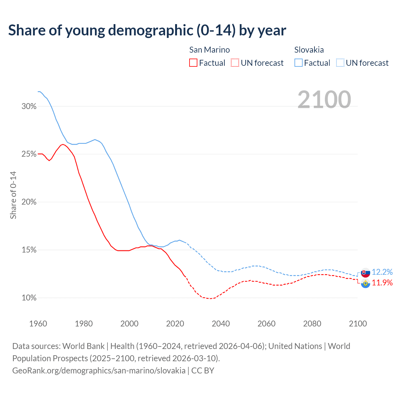 - The share of young demographic (0-15 years old) in San Marino is 12.3% vs 15.8% in Slovakia.
