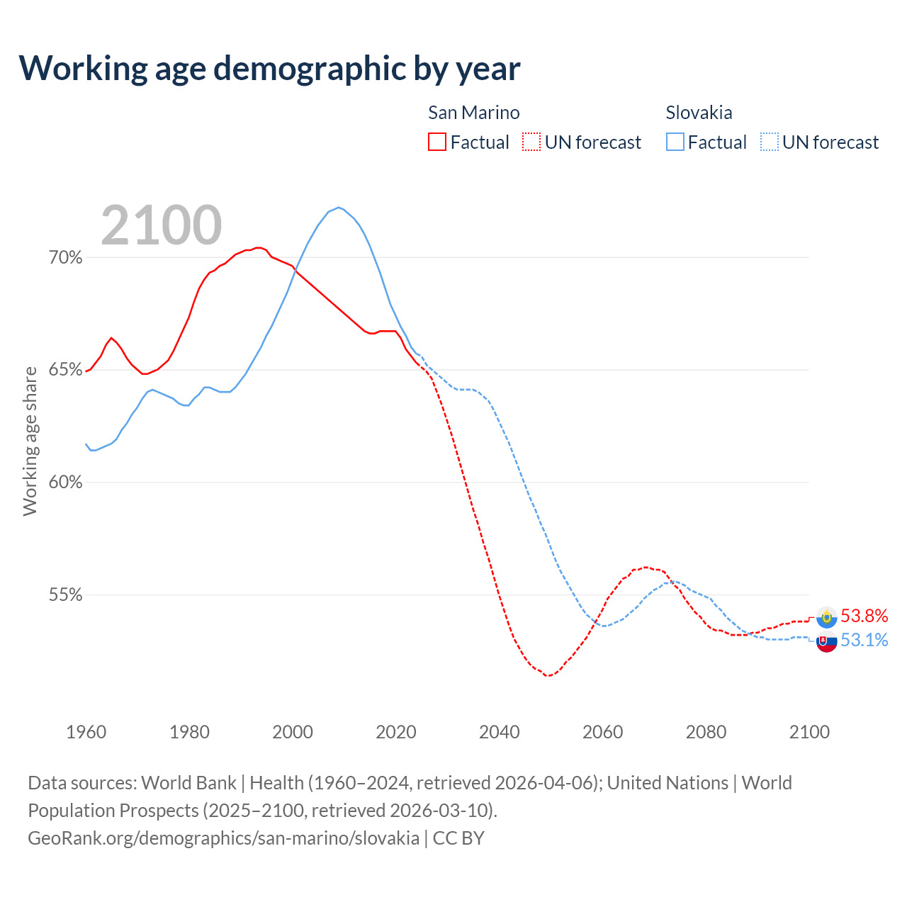 - San Marino has 22.2K working age adults (aged 15-64) vs 3.52M in Slovakia.