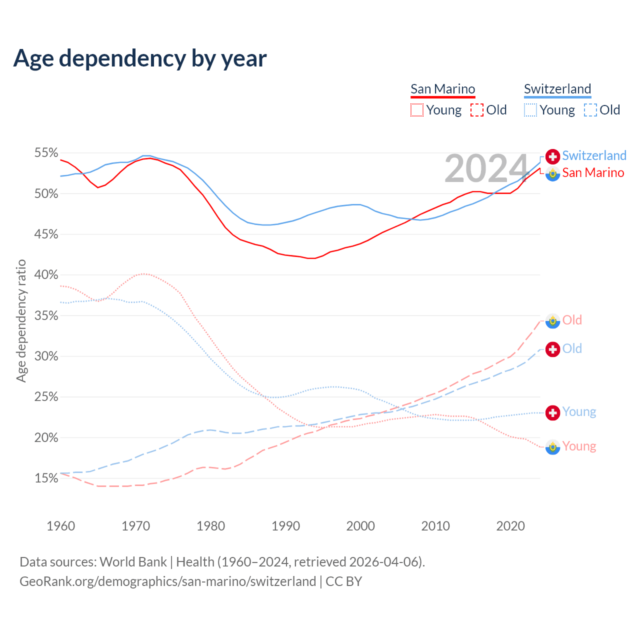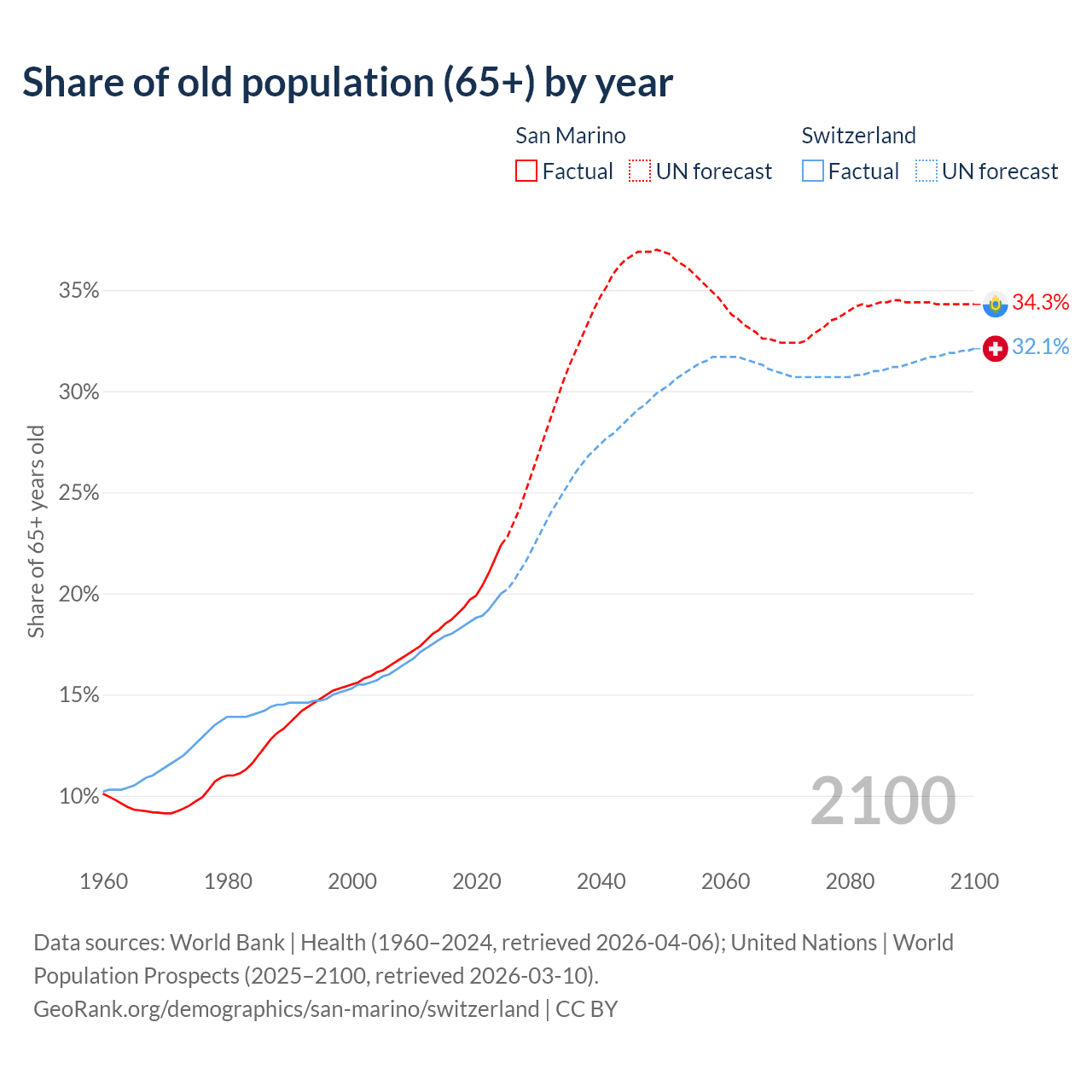 The share of older people aged 65 and over is 22.4% in San Marino and 20% in Switzerland. Life expectancy in San Marino compared to Switzerland .