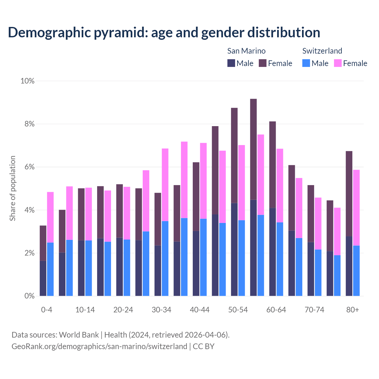 - San Marino is ranked 3/196 by median age (oldest to youngest) vs 24/196 for Switzerland.