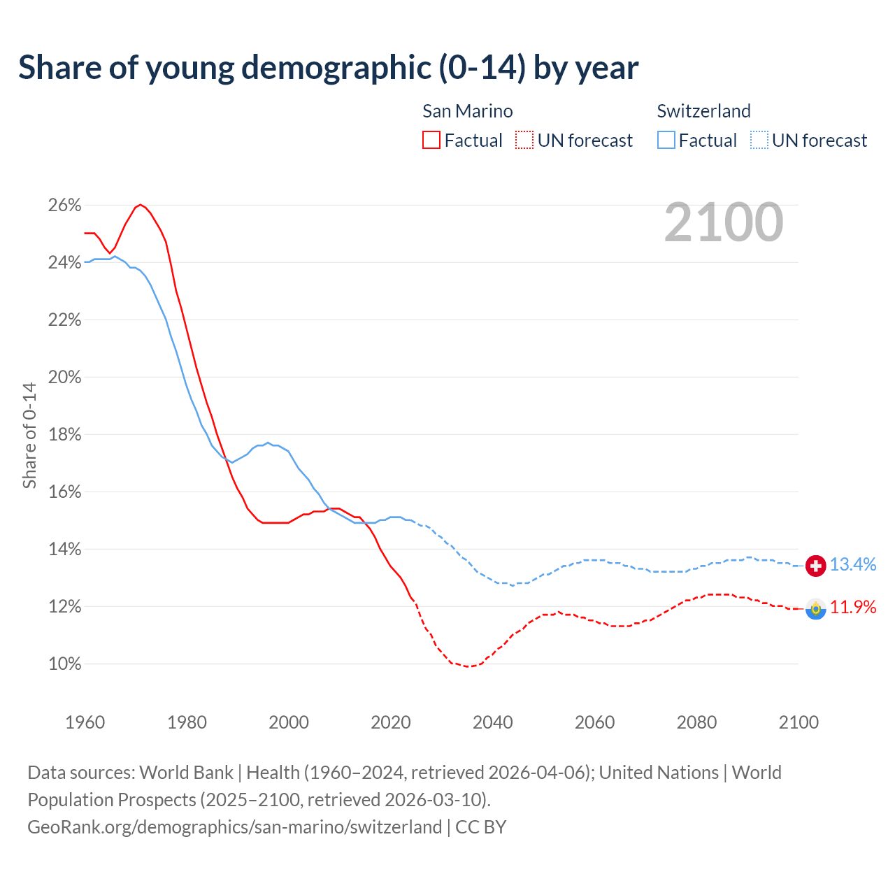 - The share of young demographic (0-15 years old) in San Marino is 12.3% vs 15% in Switzerland.