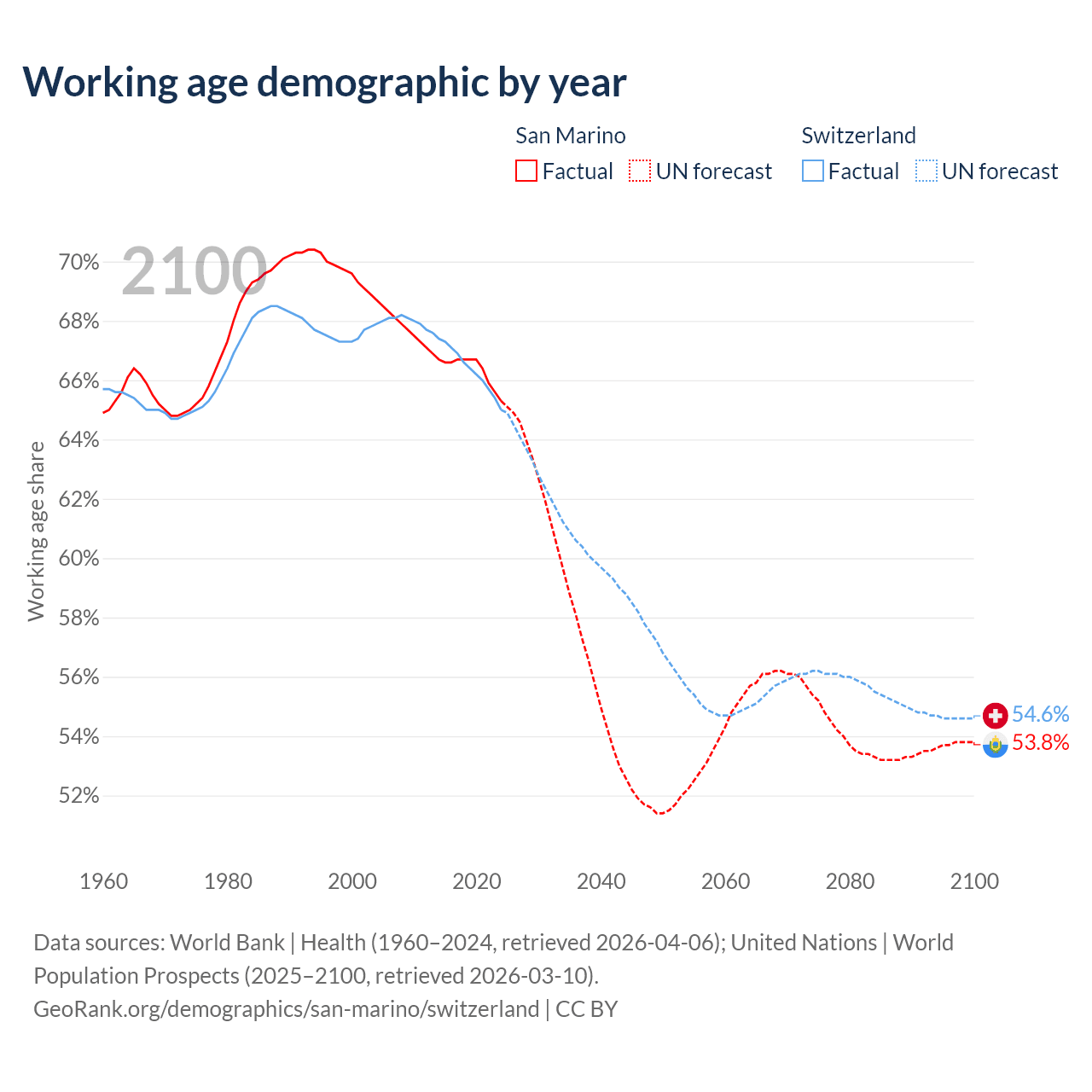 - San Marino has 22.2K working age adults (aged 15-64) vs 5.92M in Switzerland.
