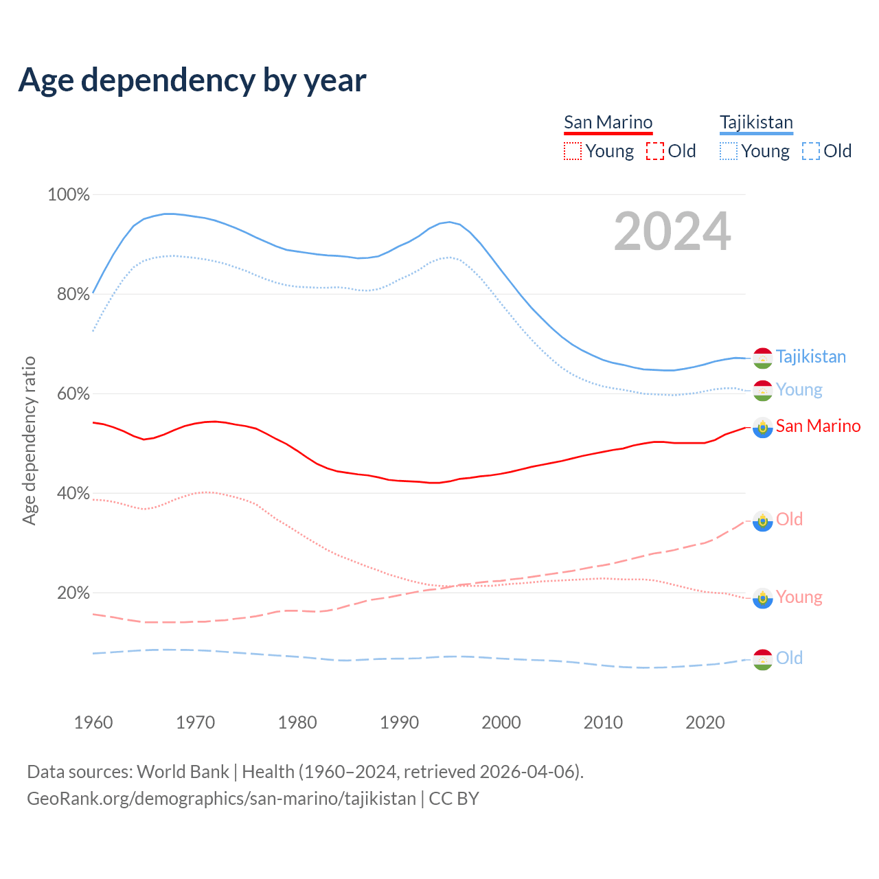 - The share of old-age demographic (65+) in San Marino is 22.4% vs 3.85% in Tajikistan.