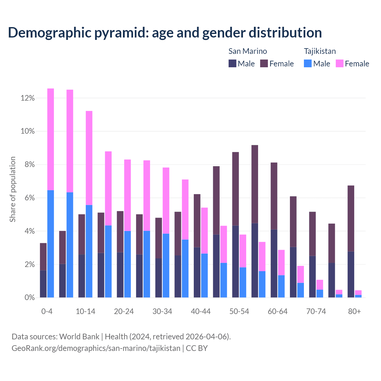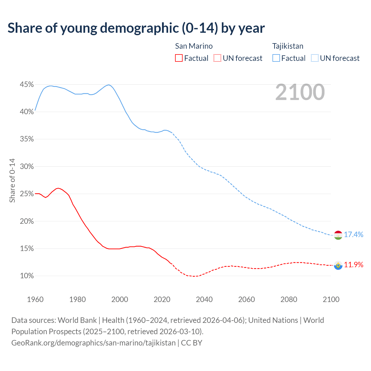 - The share of young demographic (0-15 years old) in San Marino is 12.3% vs 36.3% in Tajikistan.