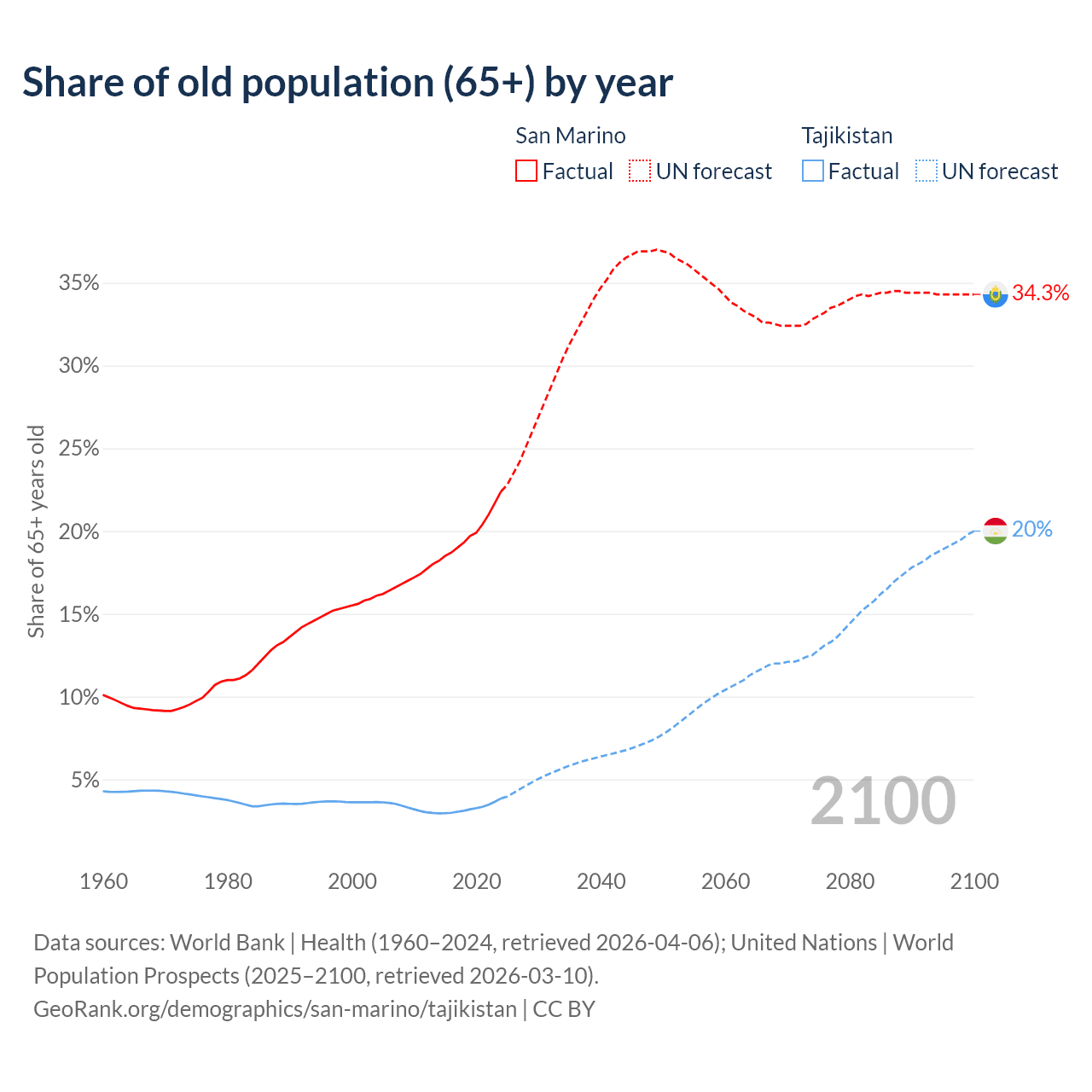 The share of older people aged 65 and over is 22.4% in San Marino and 3.85% in Tajikistan. Life expectancy in San Marino compared to Tajikistan .