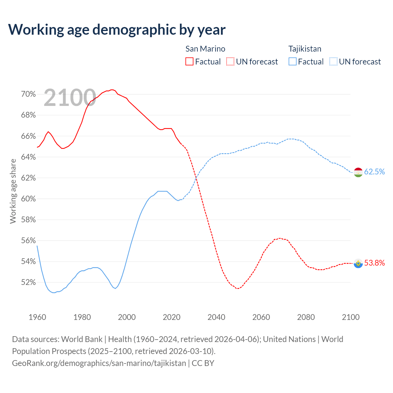 - San Marino has 22.2K working age adults (aged 15-64) vs 6.61M in Tajikistan.