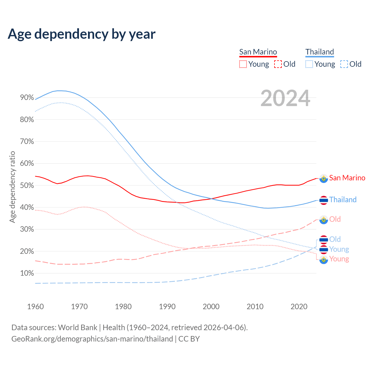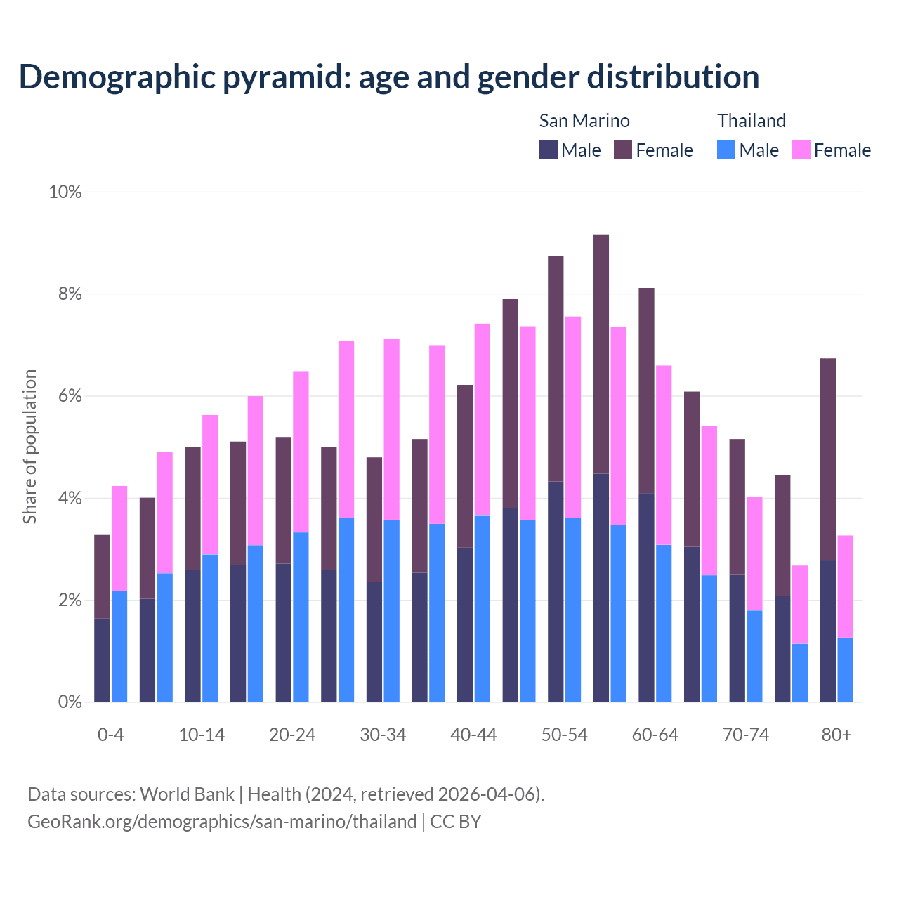 - San Marino is ranked 3/196 by median age (oldest to youngest) vs 40/196 for Thailand.