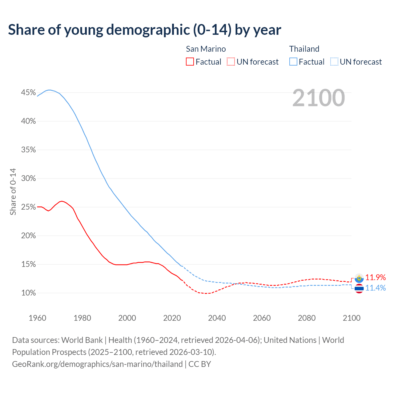- The share of young demographic (0-15 years old) in San Marino is 12.3% vs 14.7% in Thailand.