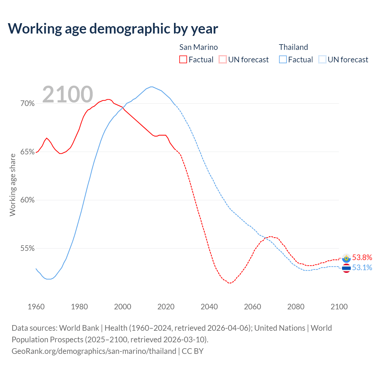 - San Marino has 22.2K working age adults (aged 15-64) vs 50M in Thailand.