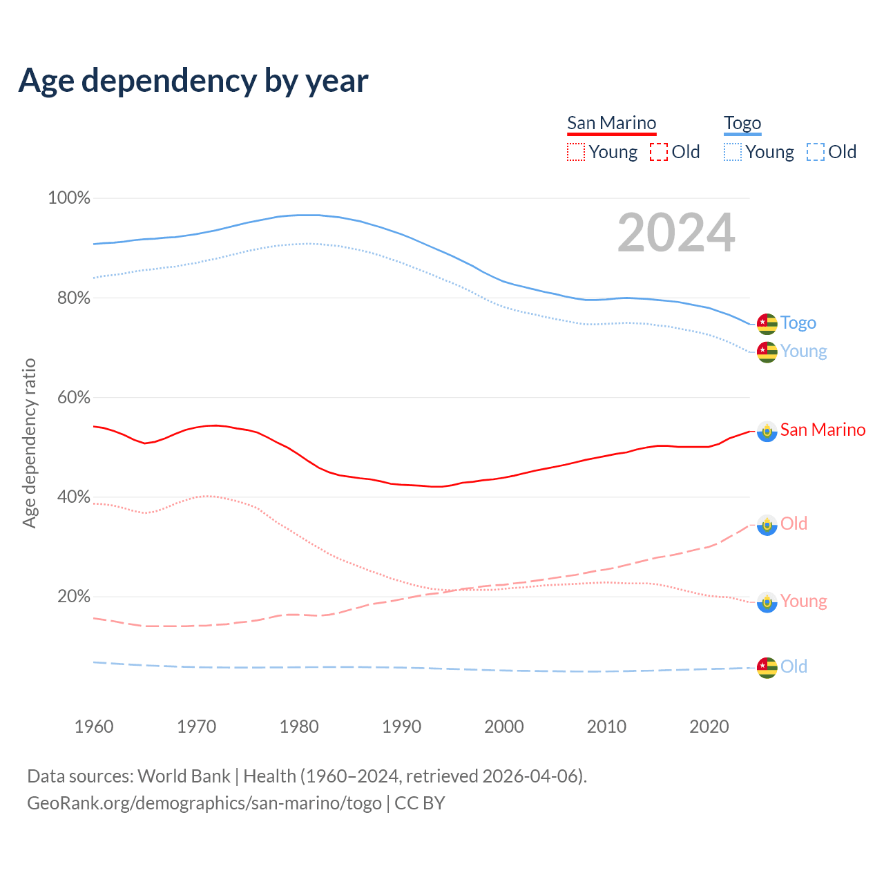 - The share of old-age demographic (65+) in San Marino is 22.4% vs 3.21% in Togo.