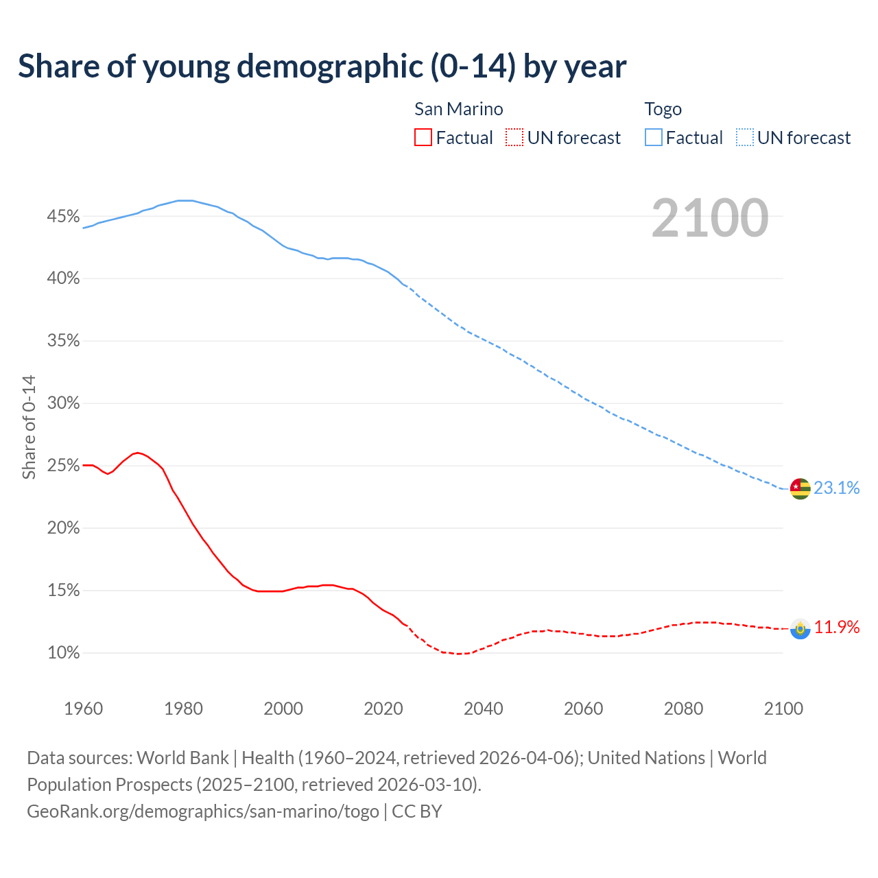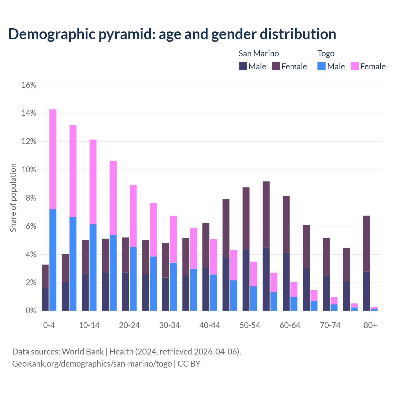 - The share of young demographic (0-15 years old) in San Marino is 12.3% vs 39.5% in Togo.