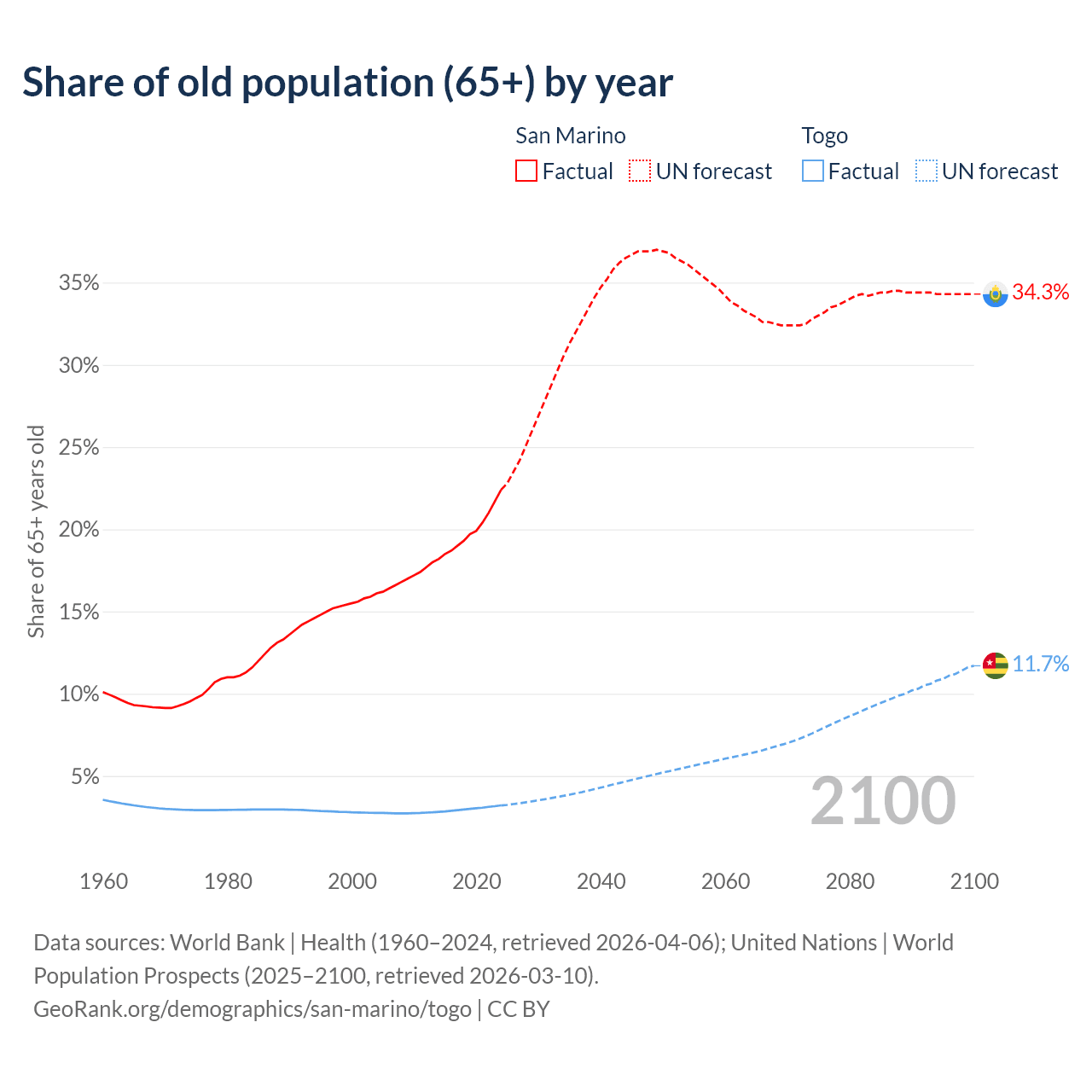 The share of older people aged 65 and over is 22.4% in San Marino and 3.21% in Togo. Life expectancy in San Marino compared to Togo .