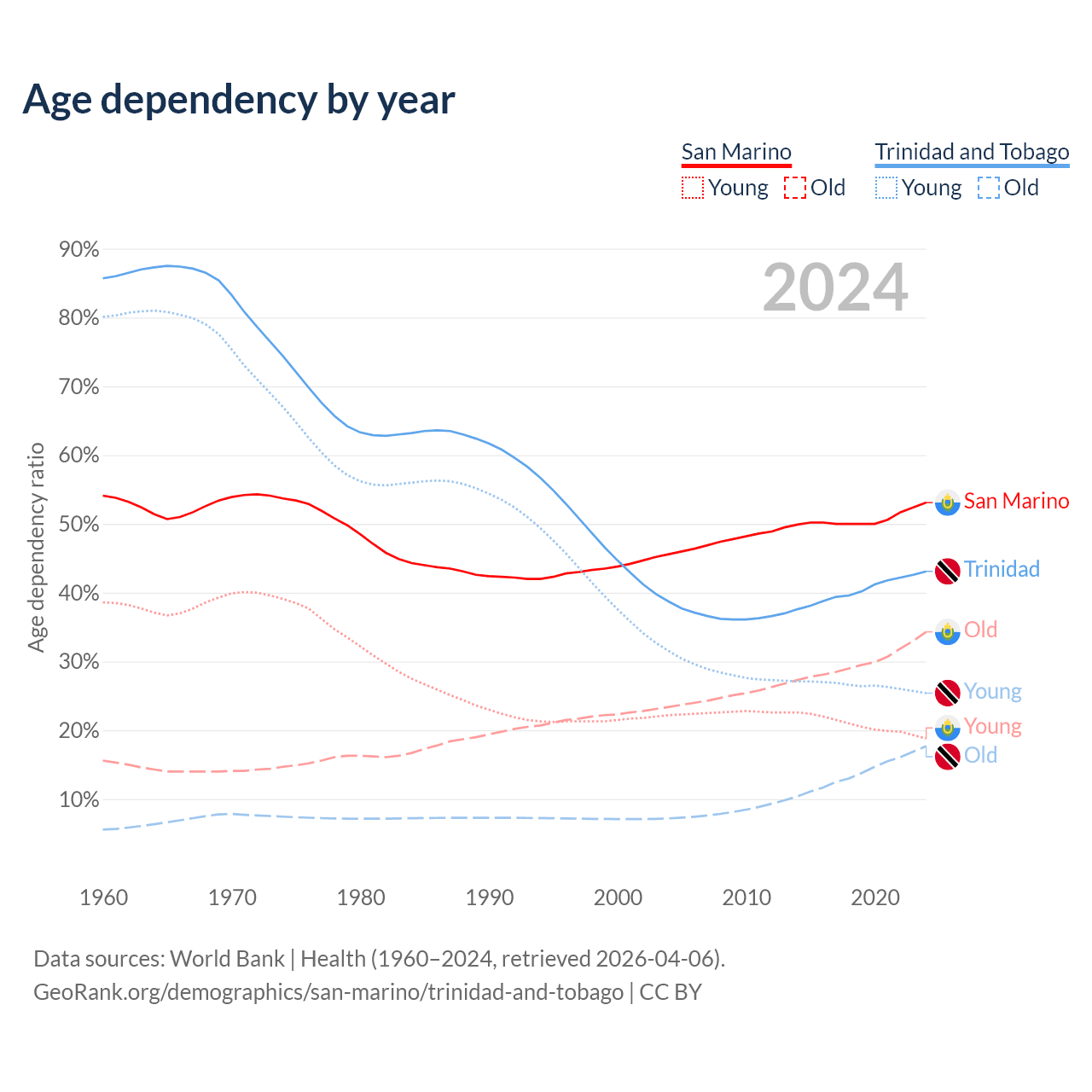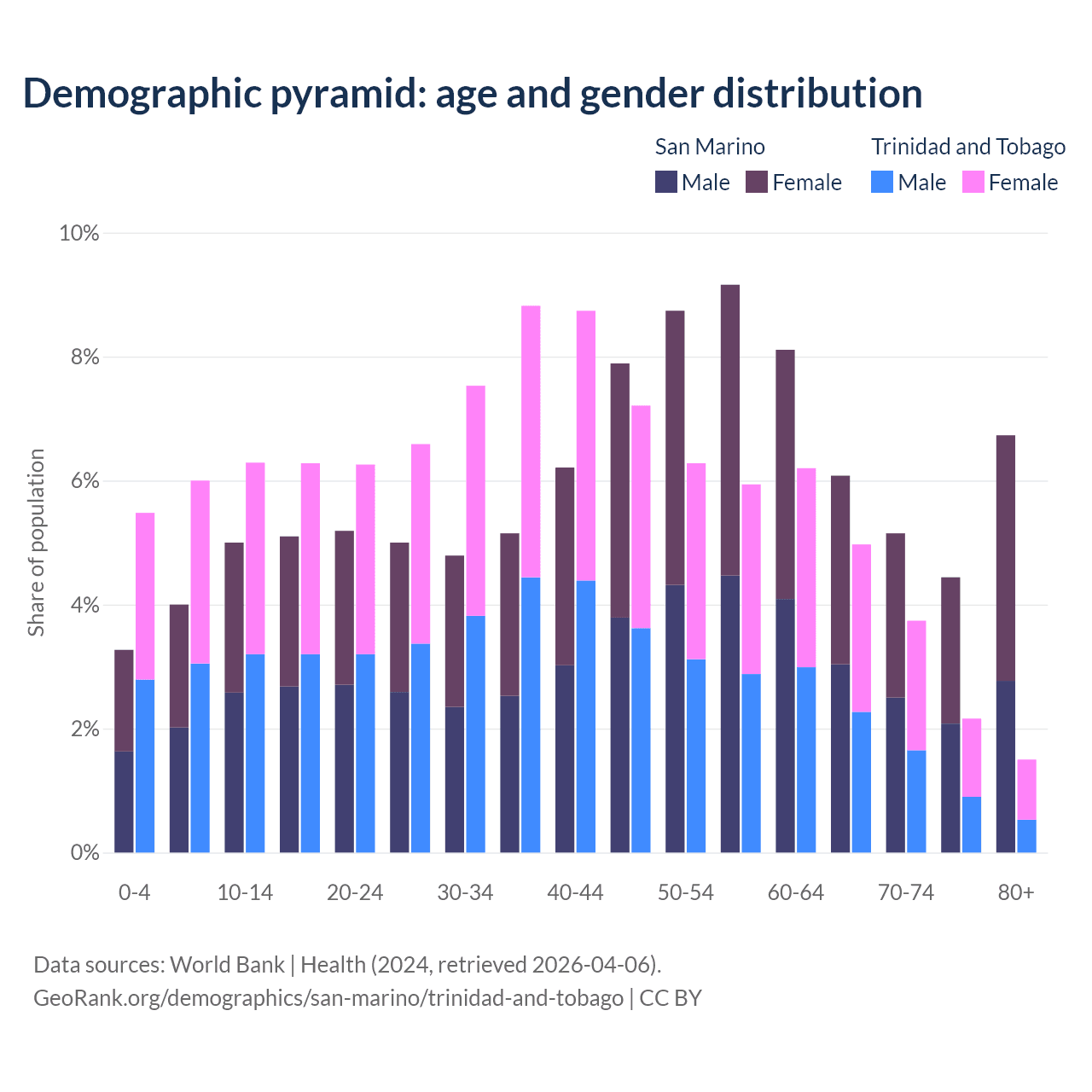 - The share of old-age demographic (65+) in San Marino is 22.4% vs 12.4% in Trinidad and Tobago.