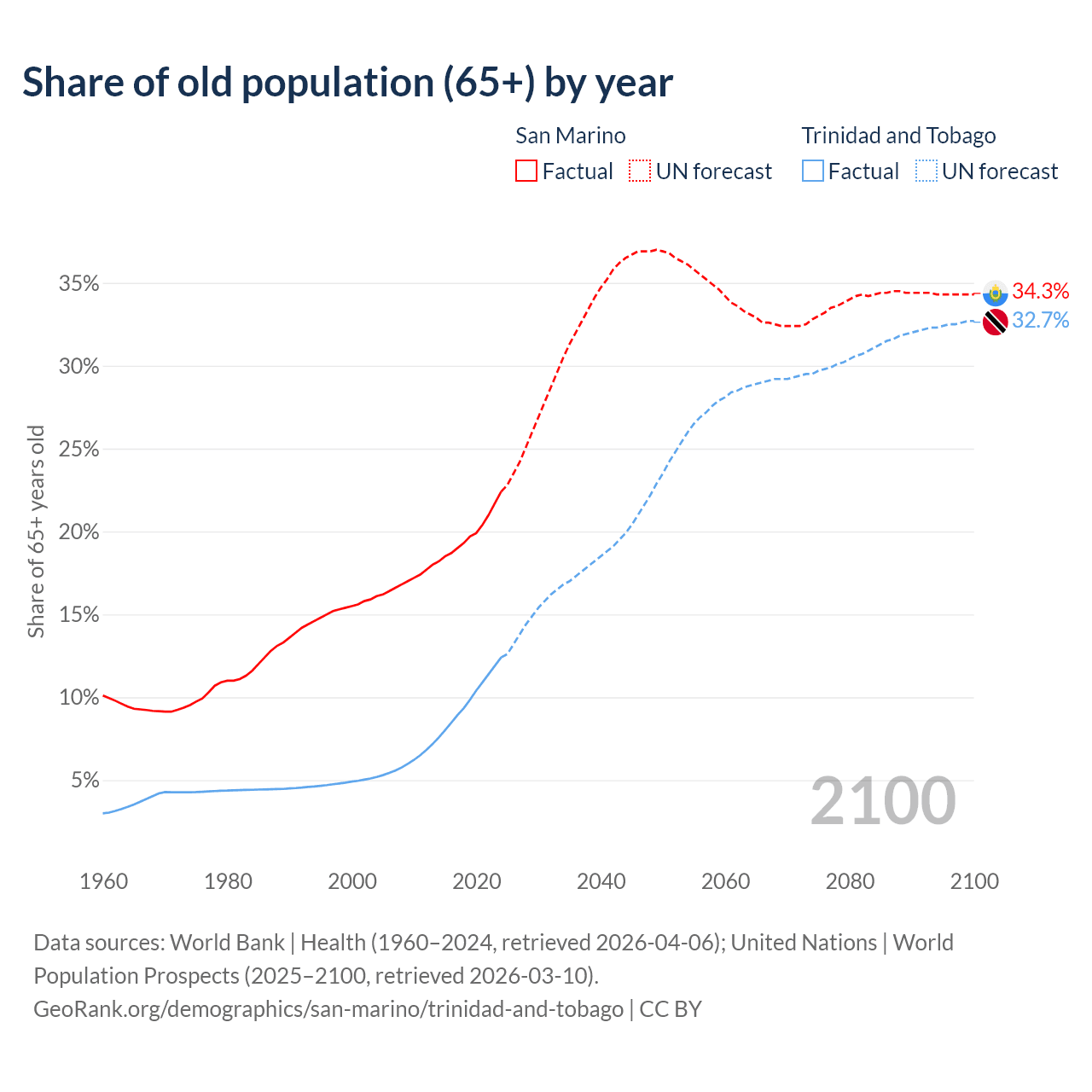 Median age San Marino vs Trinidad and Tobago, 1960-2100