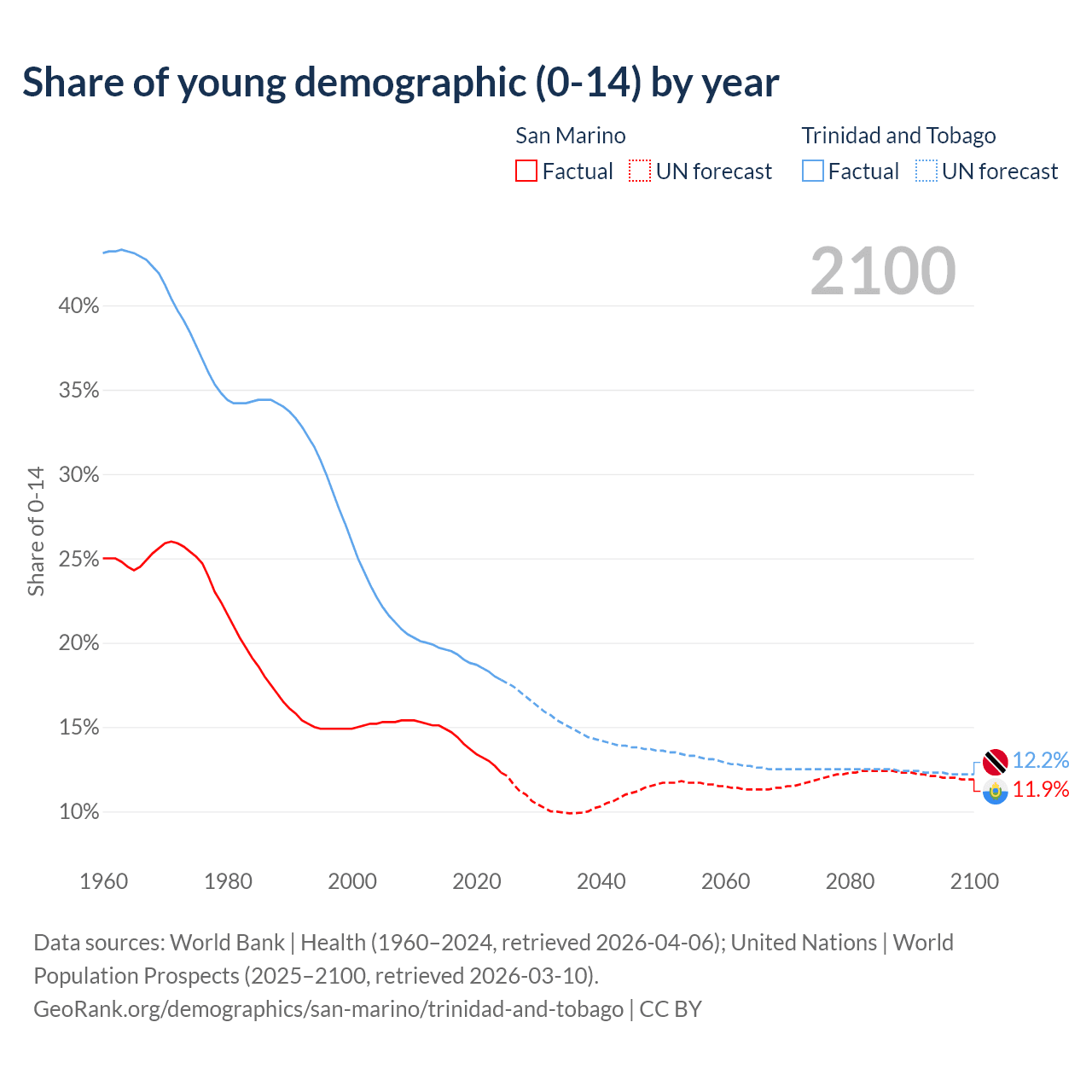 - The share of young demographic (0-15 years old) in San Marino is 12.3% vs 17.8% in Trinidad and Tobago.