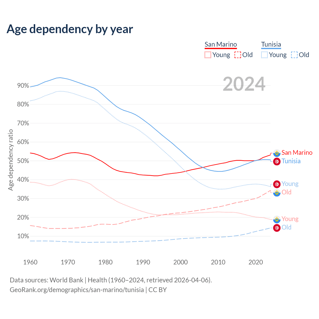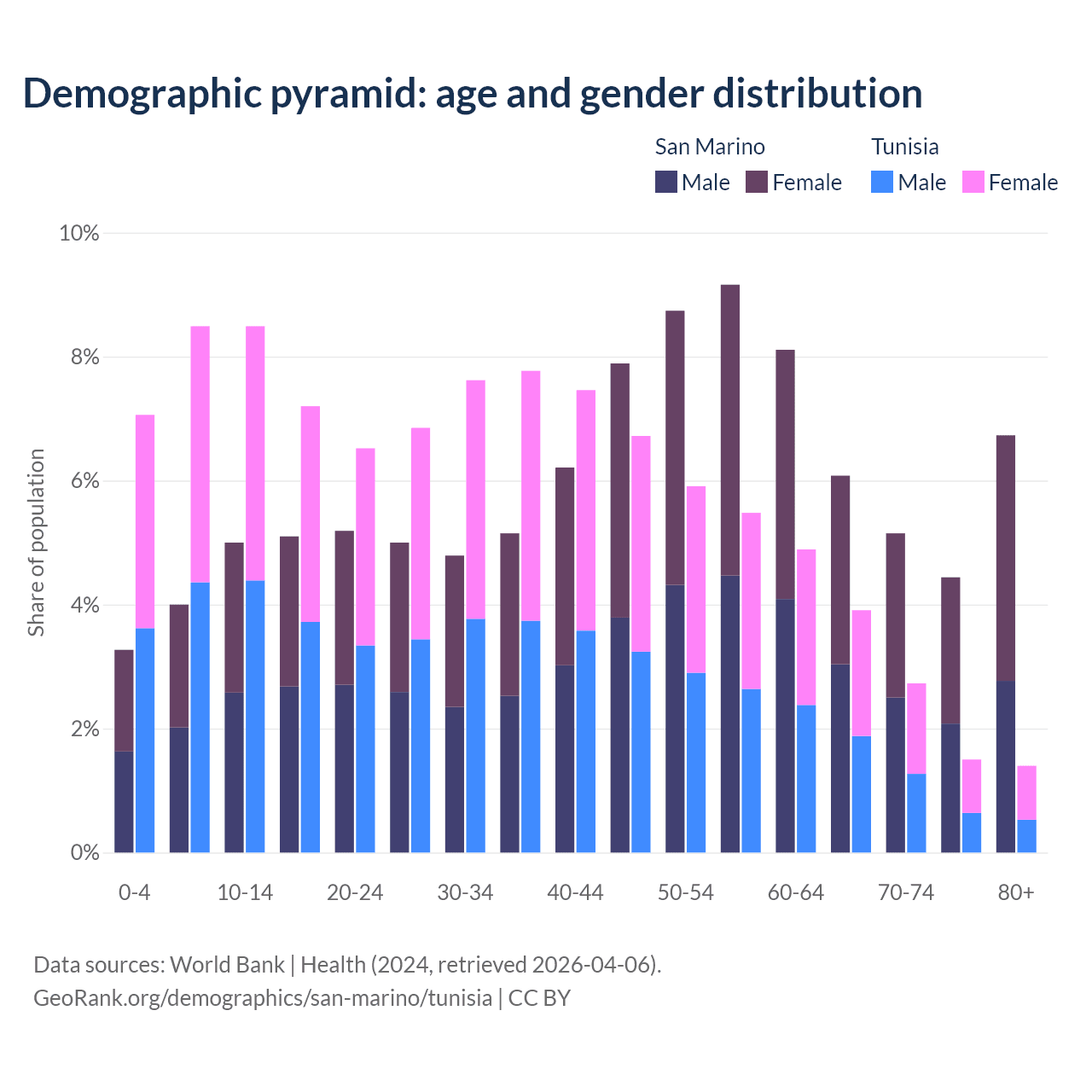 - The share of old-age demographic (65+) in San Marino is 22.4% vs 9.53% in Tunisia.