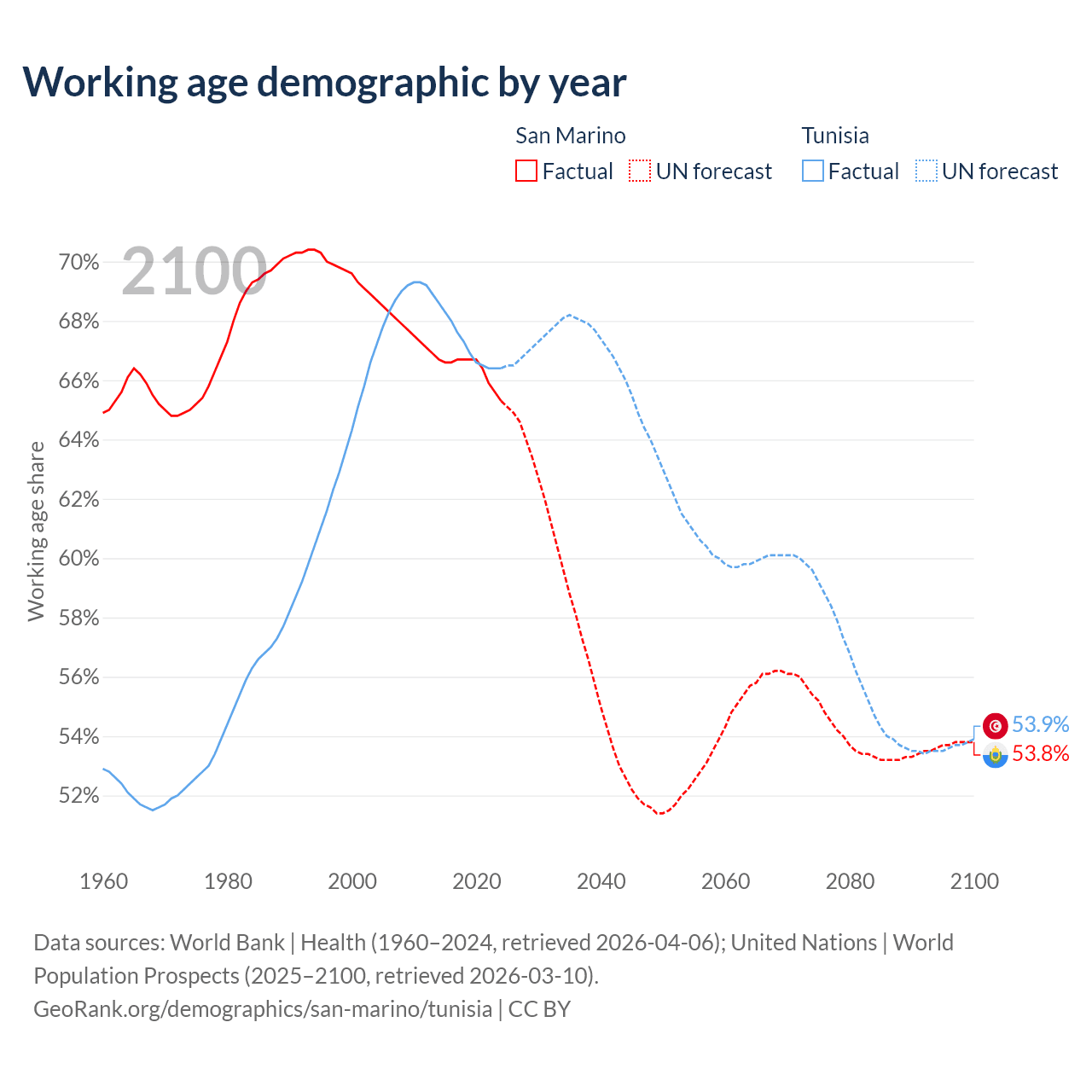- San Marino has 22.2K working age adults (aged 15-64) vs 8.26M in Tunisia.