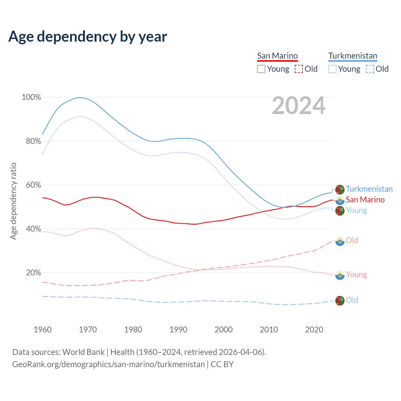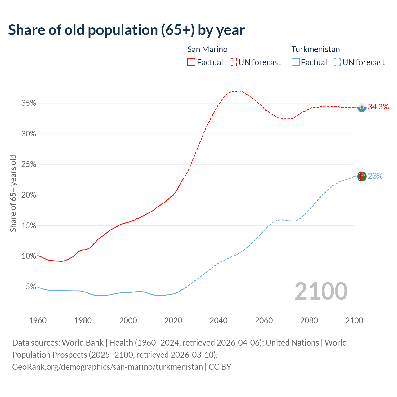 - The share of old-age demographic (65+) in San Marino is 22.4% vs 4.53% in Turkmenistan.